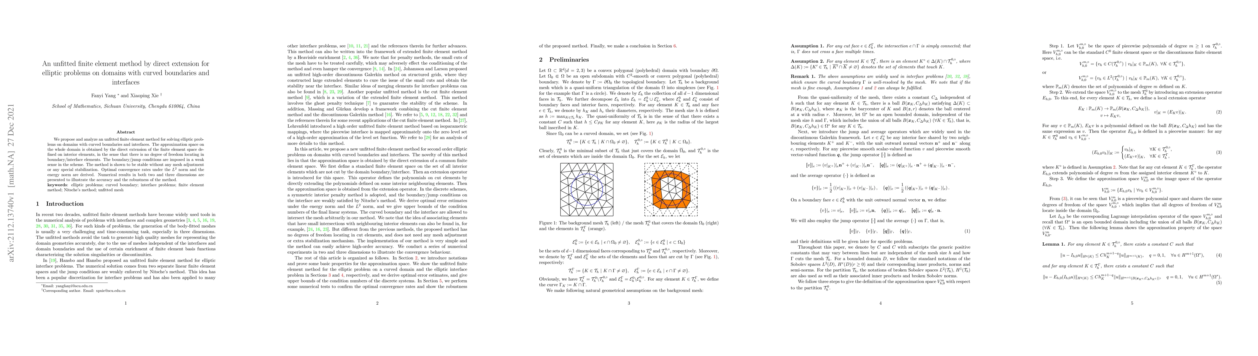 This paper introduces an unfitted finite element method for elliptic problems on domains with curved boundaries and interfaces, employing direct extension of finite element spaces without special stabilization. The method demonstrates stability and optimal convergence rates, validated by numerical results in two and three dimensions.