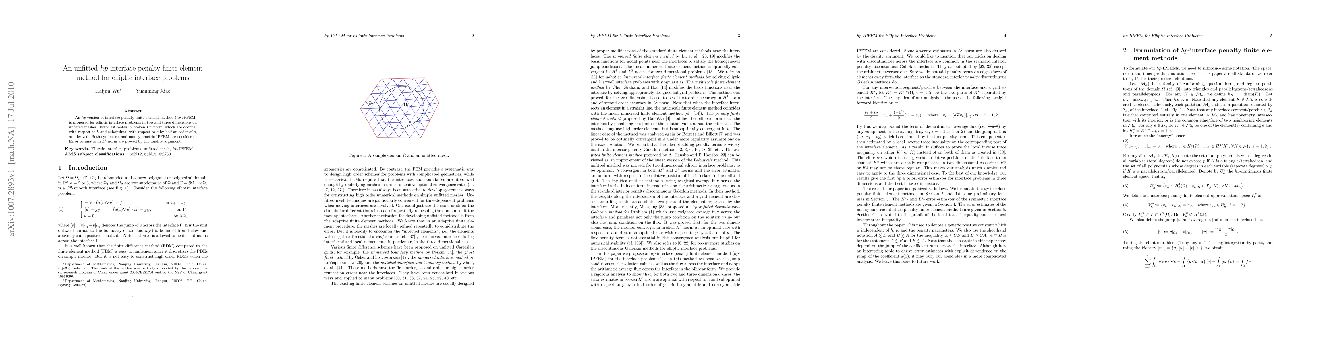Summary: The paper introduces an $hp$-IPFEM for solving elliptic interface problems on unfitted meshes, deriving optimal $h$-based and suboptimal $p$-based error estimates in $H^1$ norm, and proving $L^2$ norm error estimates via duality for both symmetric and non-symmetric formulations.
