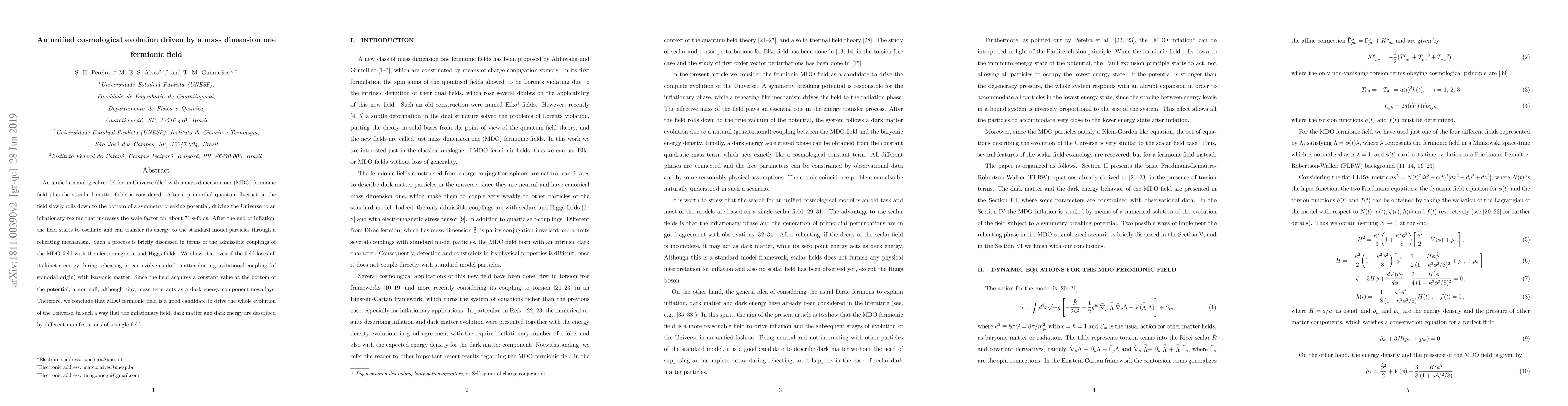 An unified cosmological model for an Universe filled with a mass dimension one (MDO) fermionic field plus the standard matter fields is considered. After a primordial quantum fluctuation the field slowly rolls down to the bottom of a symmetry breaking potential, driving the Universe to an inflationary regime that increases the scale factor for about 71 e-folds. After the end of inflation, the field starts to oscillate and can transfer its energy to the standard model particles through a reheating mechanism. Such a process is briefly discussed in terms of the admissible couplings of the MDO field with the electromagnetic and Higgs fields. We show that even if the field loses all its kinetic energy during reheating, it can evolve as dark matter due a gravitational coupling (of spinorial origin) with baryonic matter. Since the field acquires a constant value at the bottom of the potential, a non-null, although tiny, mass term acts as a dark energy component nowadays. Therefore, we conclude that MDO fermionic field is a good candidate to drive the whole evolution of the Universe, in such a way that the inflationary field, dark matter and dark energy are described by different manifestations of a single field.
