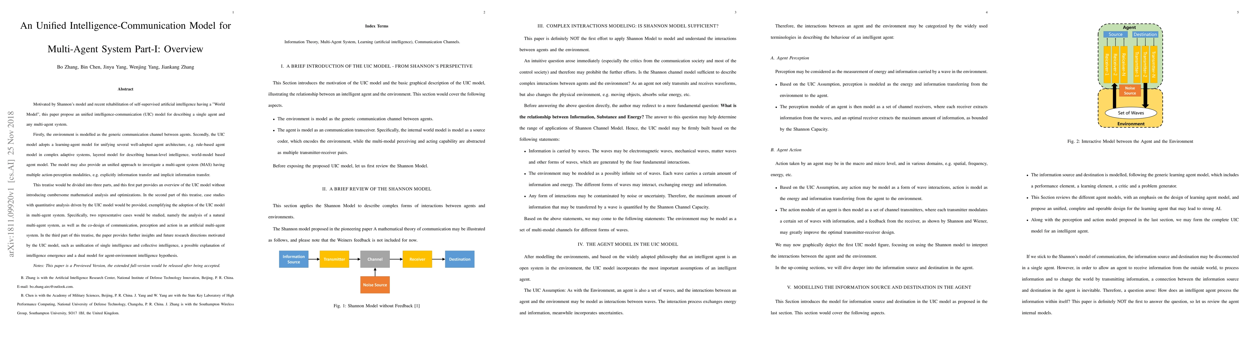 Motivated by Shannon's model and recent rehabilitation of self-supervised artificial intelligence having a "World Model", this paper propose an unified intelligence-communication (UIC) model for describing a single agent and any multi-agent system. Firstly, the environment is modelled as the generic communication channel between agents. Secondly, the UIC model adopts a learning-agent model for unifying several well-adopted agent architecture, e.g. rule-based agent model in complex adaptive systems, layered model for describing human-level intelligence, world-model based agent model. The model may also provide an unified approach to investigate a multi-agent system (MAS) having multiple action-perception modalities, e.g. explicitly information transfer and implicit information transfer. This treatise would be divided into three parts, and this first part provides an overview of the UIC model without introducing cumbersome mathematical analysis and optimizations. In the second part of this treatise, case studies with quantitative analysis driven by the UIC model would be provided, exemplifying the adoption of the UIC model in multi-agent system. Specifically, two representative cases would be studied, namely the analysis of a natural multi-agent system, as well as the co-design of communication, perception and action in an artificial multi-agent system. In the third part of this treatise, the paper provides further insights and future research directions motivated by the UIC model, such as unification of single intelligence and collective intelligence, a possible explanation of intelligence emergence and a dual model for agent-environment intelligence hypothesis. Notes: This paper is a Previewed Version, the extended full-version would be released after being accepted.