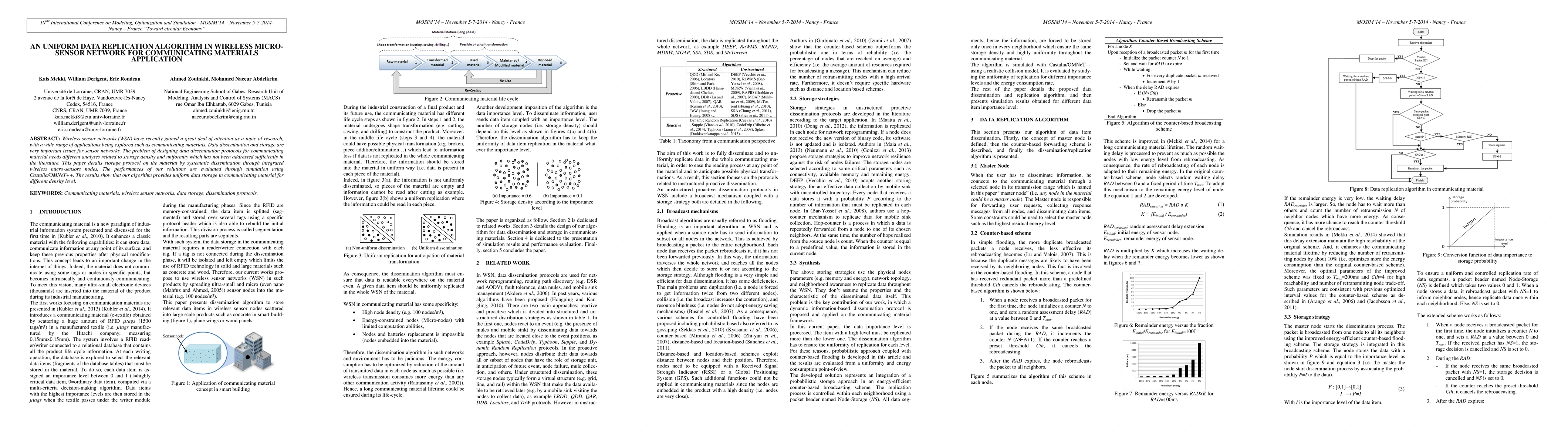 Wireless sensor networks (WSN) have recently gained a great deal of attention as a topic of research, with a wide range of applications being explored such as communicating materials. Data dissemination and storage are very important issues for sensor networks. The problem of designing data dissemination protocols for communicating material needs different analyses related to storage density and uniformity which has not been addressed sufficiently in the literature. This paper details storage protocol on the material by systematic dissemination through integrated wireless micro-sensors nodes. The performances of our solutions are evaluated through simulation using Castalia/OMNeT++. The results show that our algorithm provides uniform data storage in communicating material for different density level.
