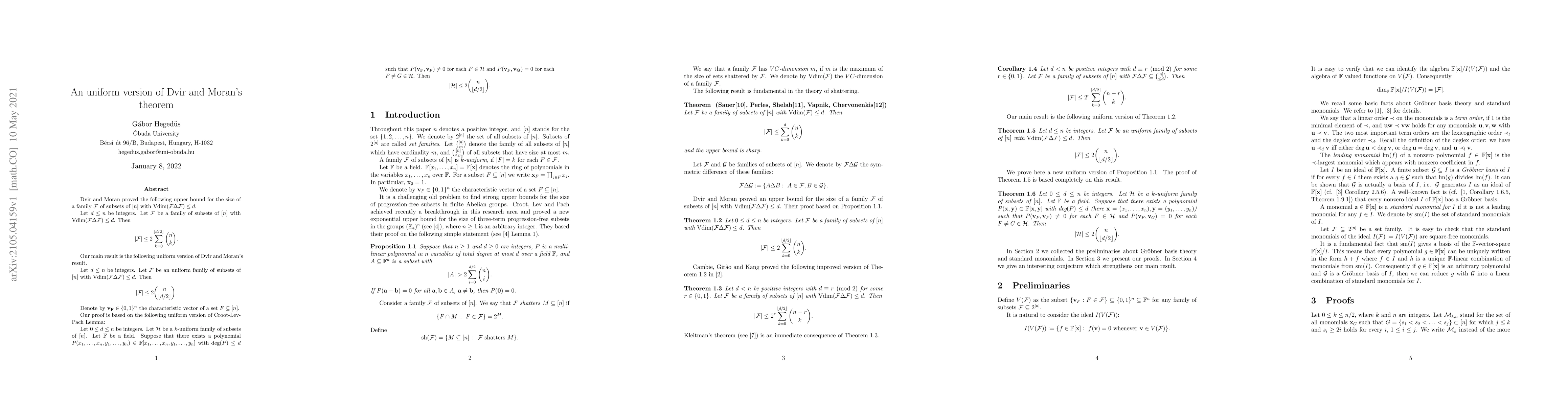A uniform version of Dvir and Moran's theorem is proven, providing an upper bound for the size of a family of subsets with a certain dimension.