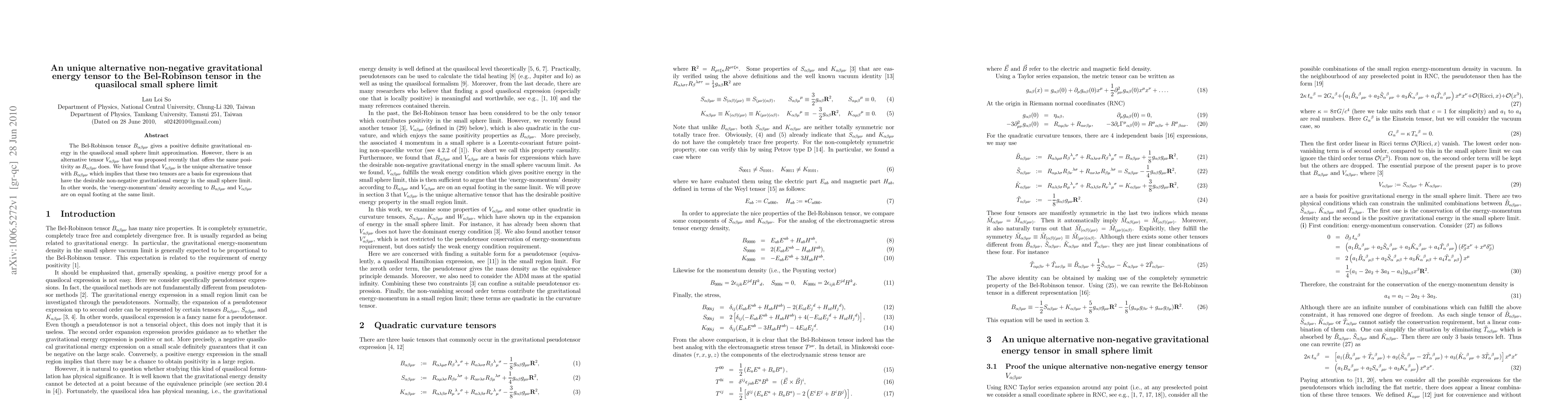Researchers find a unique alternative tensor to the Bel-Robinson tensor that also produces non-negative gravitational energy in the quasilocal small sphere limit, offering an additional basis for expressing desirable properties of gravity.
