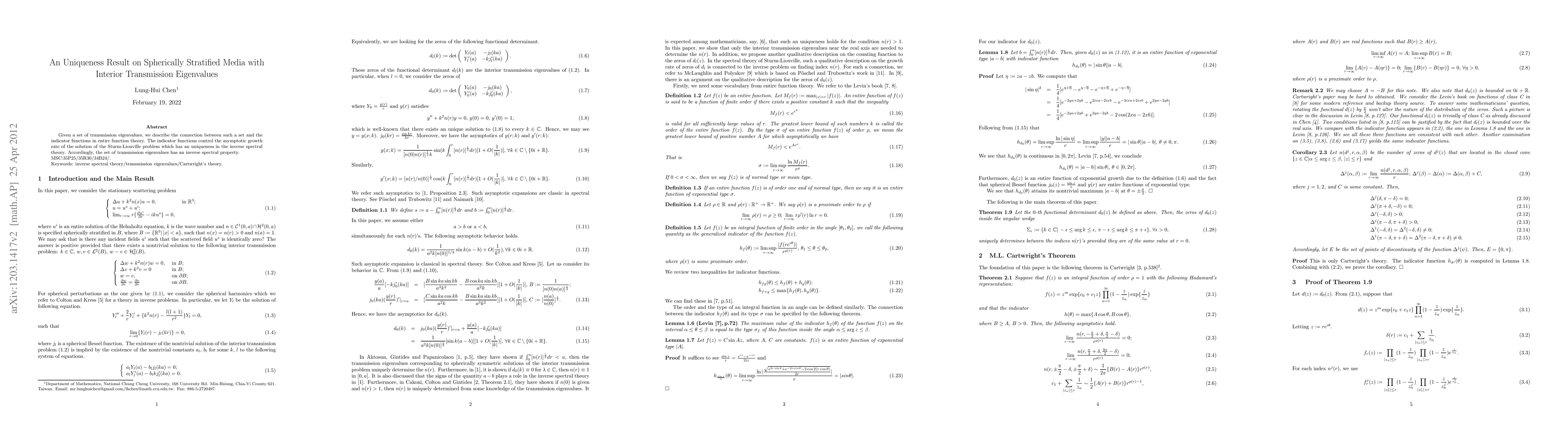 This paper establishes a uniqueness result for spherically stratified media by linking transmission eigenvalues to indicator functions in entire function theory, demonstrating that these eigenvalues possess an inverse spectral property. The indicator functions govern the asymptotic growth of solutions in the Sturm-Liouville problem, ensuring uniqueness in inverse spectral theory.