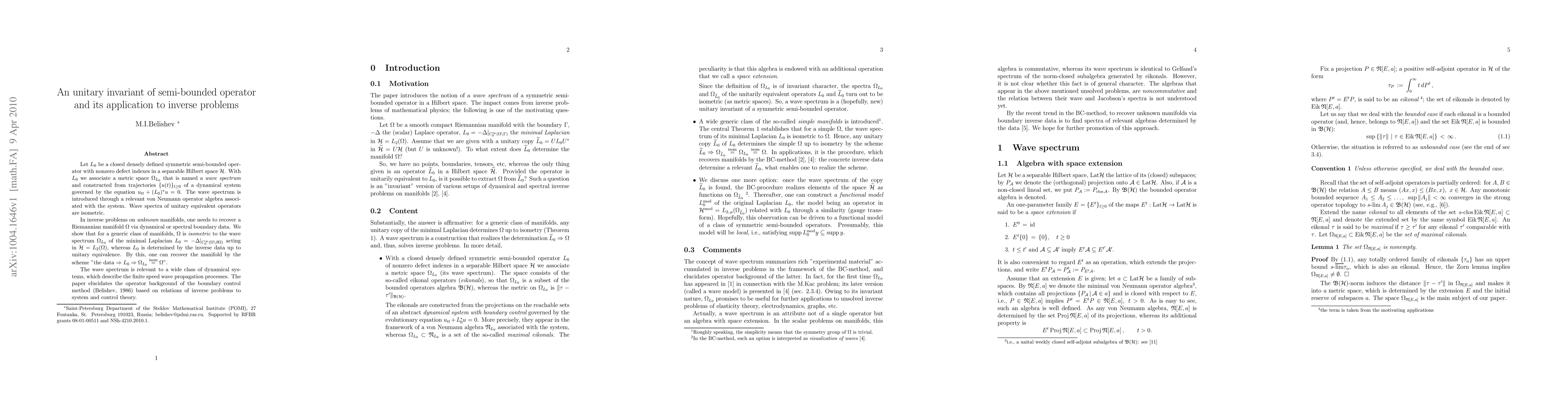 Let $L_0$ be a closed densely defined symmetric semi-bounded operator with nonzero defect indexes in a separable Hilbert space ${\cal H}$. With $L_0$ we associate a metric space $\Omega_{L_0}$ that is named a {\it wave spectrum} and constructed from trajectories $\{u(t)\}_{t \geq 0}$ of a dynamical system governed by the equation $u_{tt}+(L_0)^*u=0$. The wave spectrum is introduced through a relevant von Neumann operator algebra associated with the system. Wave spectra of unitary equivalent operators are isometric. In inverse problems on {\it unknown} manifolds, one needs to recover a Riemannian manifold $\Omega$ via dynamical or spectral boundary data. We show that for a generic class of manifolds, $\Omega$ is {\it isometric} to the wave spectrum $\Omega_{L_0}$ of the minimal Laplacian $L_0=-\Delta|_{C^\infty_0(\Omega\backslash \partial \Omega)}$ acting in ${\cal H}=L_2(\Omega)$, whereas $L_0$ is determined by the inverse data up to unitary equivalence. By this, one can recover the manifold by the scheme "the data $\Rightarrow L_0 \Rightarrow \Omega_{L_0} \overset{\rm isom}= \Omega$". The wave spectrum is relevant to a wide class of dynamical systems, which describe the finite speed wave propagation processes. The paper elucidates the operator background of the boundary control method (Belishev, 1986) based on relations of inverse problems to system and control theory.