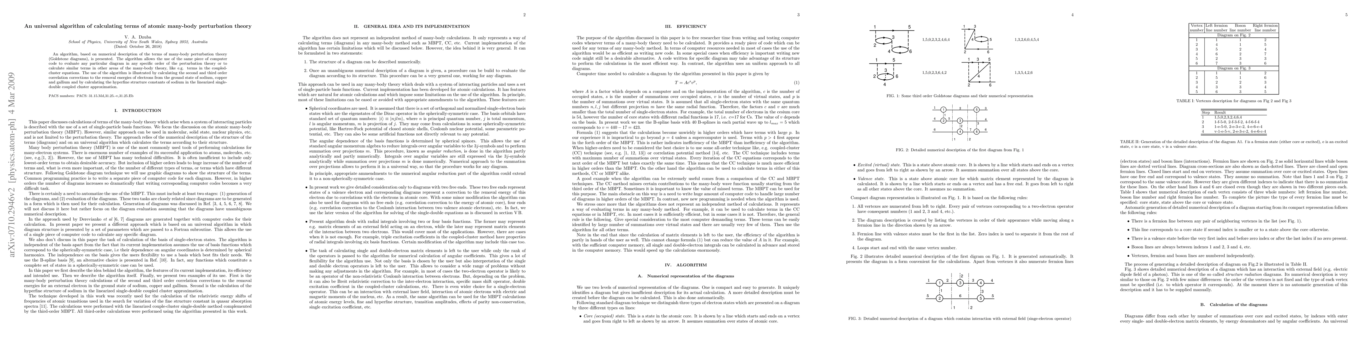 This paper introduces a universal algorithm for calculating terms in atomic many-body perturbation theory, enabling the evaluation of Goldstone diagrams in various orders and applications, such as coupled-cluster equations. The algorithm's effectiveness is demonstrated through calculations of electron removal energies and hyperfine structure constants.