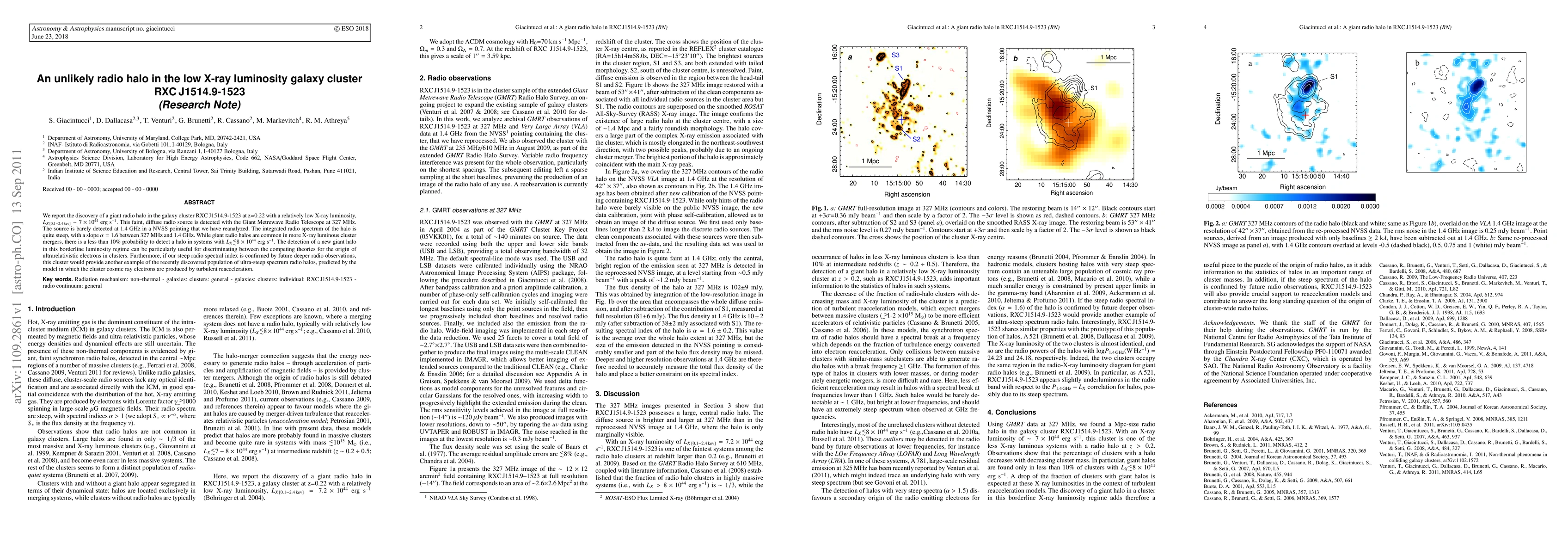 This paper reports the discovery of a rare giant radio halo in the low X-ray luminosity galaxy cluster RXC J1514.9-1523, detected at 327 MHz and barely at 1.4 GHz. The finding challenges existing theories about the origin of ultrarelativistic electrons in clusters and may support models involving turbulent reacceleration of cosmic ray electrons.