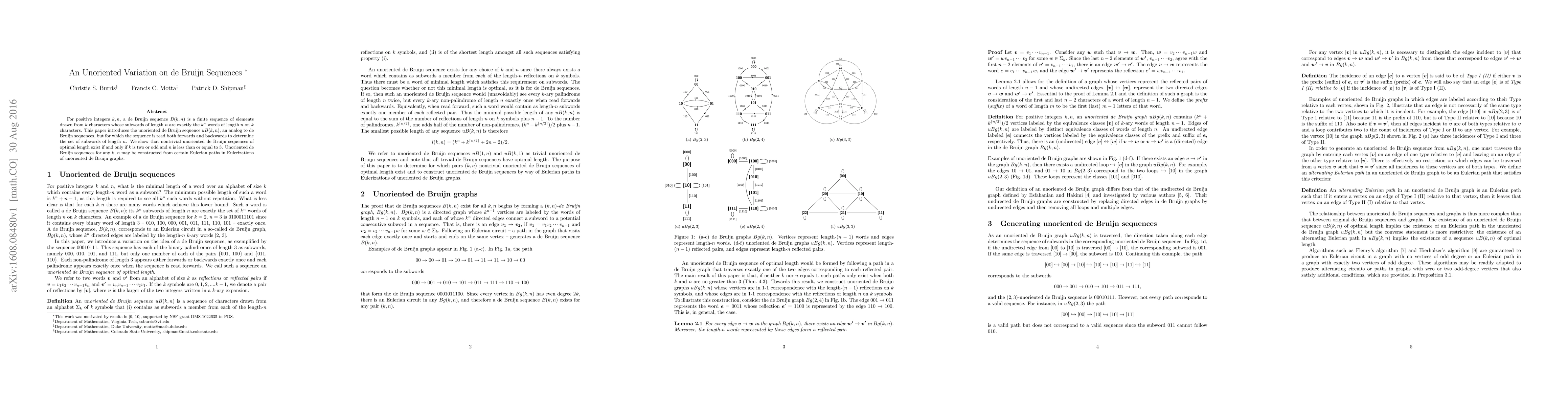 This paper introduces unoriented de Bruijn sequences $uB(k,n)$ that read both forwards and backwards, and proves their existence conditions. It shows that optimal sequences exist only when $k$ is 2 or odd and $n \leq 3$, and outlines a construction method using Eulerian paths in de Bruijn graphs.
