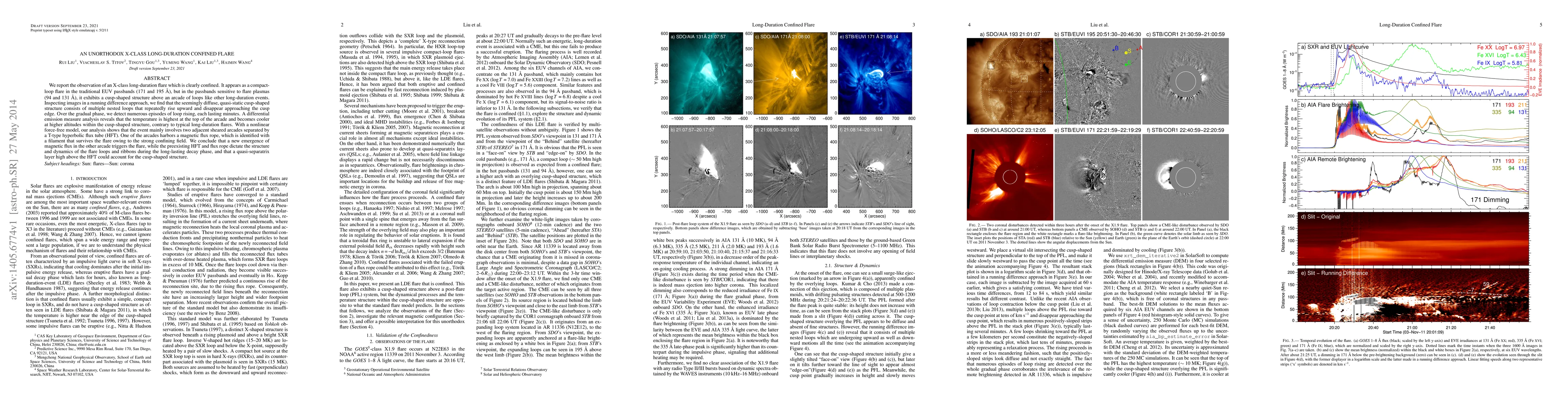 We report the observation of an X-class long-duration flare which is clearly confined. It appears as a compact-loop flare in the traditional EUV passbands (171 and 195 {\AA}), but in the passbands sensitive to flare plasmas (94 and 131 {\AA}), it exhibits a cusp-shaped structure above an arcade of loops like other long-duration events. Inspecting images in a running difference approach, we find that the seemingly diffuse, quasi-static cusp-shaped structure consists of multiple nested loops that repeatedly rise upward and disappear approaching the cusp edge. Over the gradual phase, we detect numerous episodes of loop rising, each lasting minutes. A differential emission measure analysis reveals that the temperature is highest at the top of the arcade and becomes cooler at higher altitudes within the cusp-shaped structure, contrary to typical long-duration flares. With a nonlinear force-free model, our analysis shows that the event mainly involves two adjacent sheared arcades separated by a T-type hyperbolic flux tube (HFT). One of the arcades harbors a magnetic flux rope, which is identified with a filament that survives the flare owing to the strong confining field. We conclude that a new emergence of magnetic flux in the other arcade triggers the flare, while the preexisting HFT and flux rope dictate the structure and dynamics of the flare loops and ribbons during the long-lasting decay phase, and that a quasi-separatrix layer high above the HFT could account for the cusp-shaped structure.