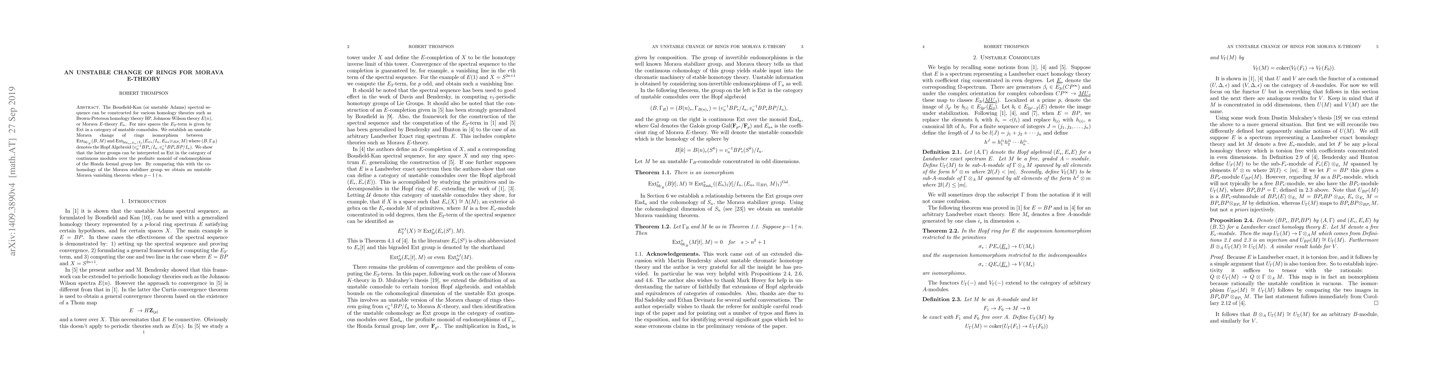 The paper establishes an unstable Morava change of rings isomorphism using Ext groups in categories of unstable comodules, leveraging the Bousfield-Kan spectral sequence for various homology theories.