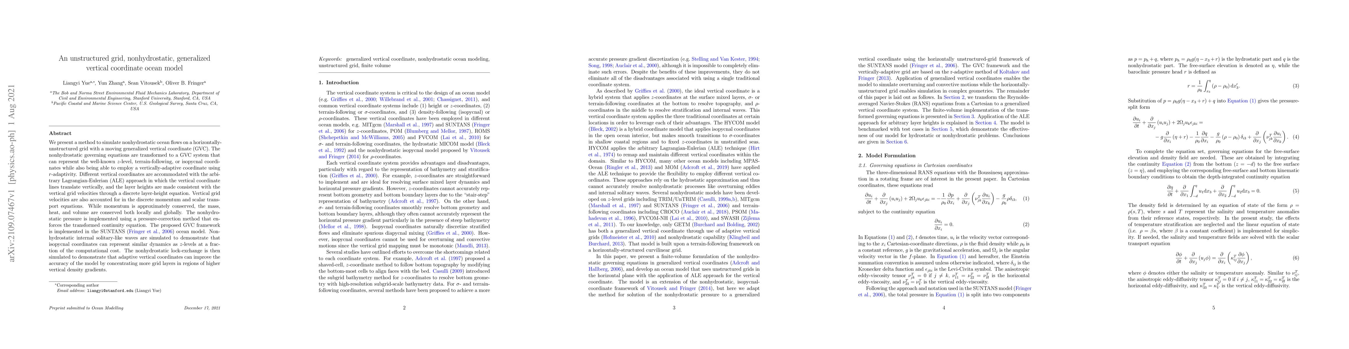 This paper introduces a nonhydrostatic ocean model on an unstructured grid using a moving generalized vertical coordinate (GVC) system. The model employs an Arbitrary Lagrangian-Eulerian (ALE) approach to adapt the vertical coordinate dynamically, conserving mass, heat, and volume while simulating internal waves and lock-exchange scenarios to demonstrate improved accuracy and efficiency.