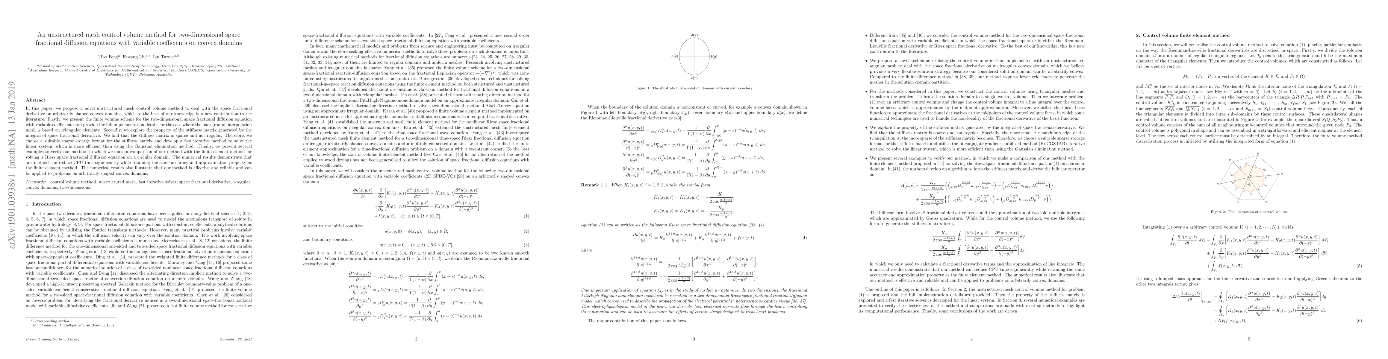 This paper introduces an unstructured mesh control volume method for solving two-dimensional space fractional diffusion equations with variable coefficients on convex domains. The proposed method efficiently handles the fractional derivative and employs a fast iterative solver for solving the resulting linear system, demonstrating significant reduction in CPU time compared to the finite element method while maintaining accuracy.