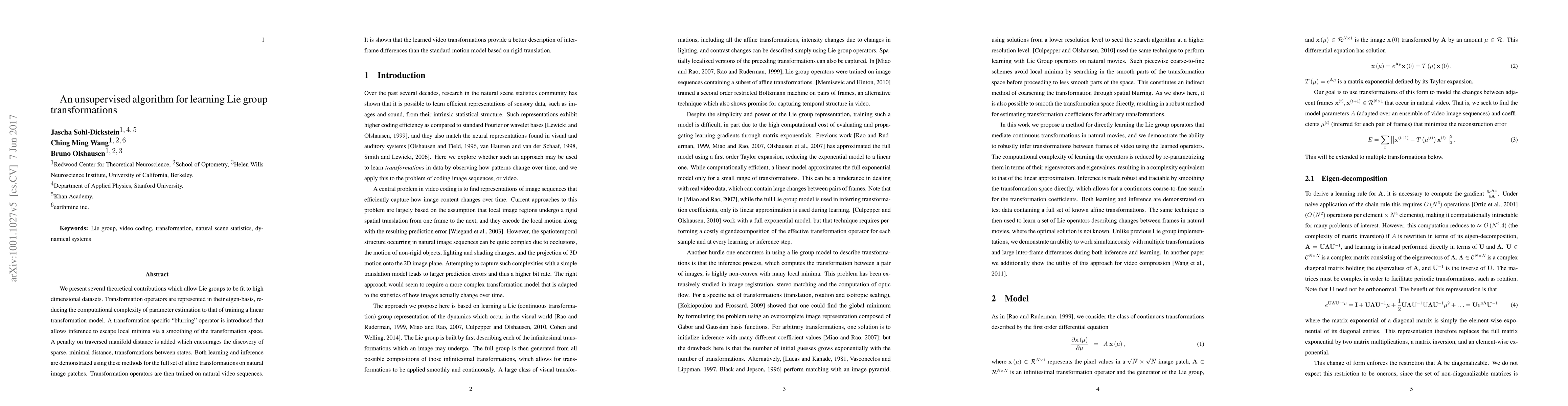We present several theoretical contributions which allow Lie groups to be fit to high dimensional datasets. Transformation operators are represented in their eigen-basis, reducing the computational complexity of parameter estimation to that of training a linear transformation model. A transformation specific "blurring" operator is introduced that allows inference to escape local minima via a smoothing of the transformation space. A penalty on traversed manifold distance is added which encourages the discovery of sparse, minimal distance, transformations between states. Both learning and inference are demonstrated using these methods for the full set of affine transformations on natural image patches. Transformation operators are then trained on natural video sequences. It is shown that the learned video transformations provide a better description of inter-frame differences than the standard motion model based on rigid translation.
