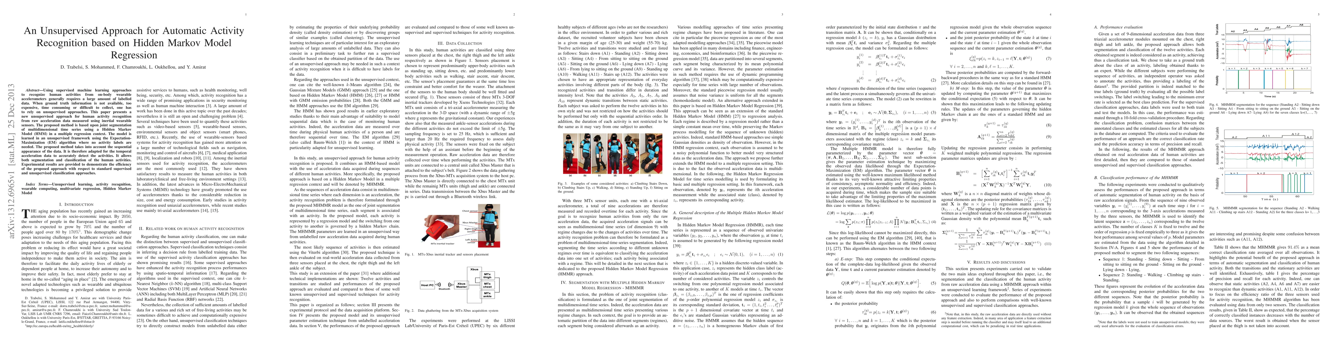This paper introduces an unsupervised method for human activity recognition using inertial wearable sensors, based on Hidden Markov Model regression and the Expectation-Maximization algorithm. The method segments and classifies activities without requiring labeled data, demonstrating efficiency compared to supervised and other unsupervised approaches.
