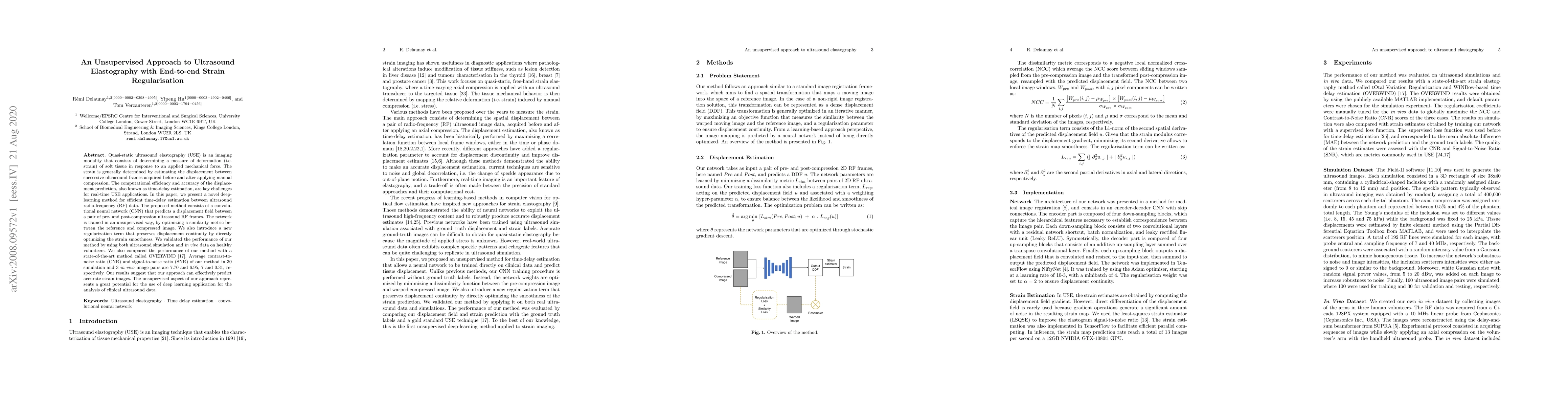 Quasi-static ultrasound elastography (USE) is an imaging modality that consists of determining a measure of deformation (i.e.strain) of soft tissue in response to an applied mechanical force. The strain is generally determined by estimating the displacement between successive ultrasound frames acquired before and after applying manual compression. The computational efficiency and accuracy of the displacement prediction, also known as time-delay estimation, are key challenges for real-time USE applications. In this paper, we present a novel deep-learning method for efficient time-delay estimation between ultrasound radio-frequency (RF) data. The proposed method consists of a convolutional neural network (CNN) that predicts a displacement field between a pair of pre- and post-compression ultrasound RF frames. The network is trained in an unsupervised way, by optimizing a similarity metric be-tween the reference and compressed image. We also introduce a new regularization term that preserves displacement continuity by directly optimizing the strain smoothness. We validated the performance of our method by using both ultrasound simulation and in vivo data on healthy volunteers. We also compared the performance of our method with a state-of-the-art method called OVERWIND [17]. Average contrast-to-noise ratio (CNR) and signal-to-noise ratio (SNR) of our method in 30 simulation and 3 in vivo image pairs are 7.70 and 6.95, 7 and 0.31, respectively. Our results suggest that our approach can effectively predict accurate strain images. The unsupervised aspect of our approach represents a great potential for the use of deep learning application for the analysis of clinical ultrasound data.