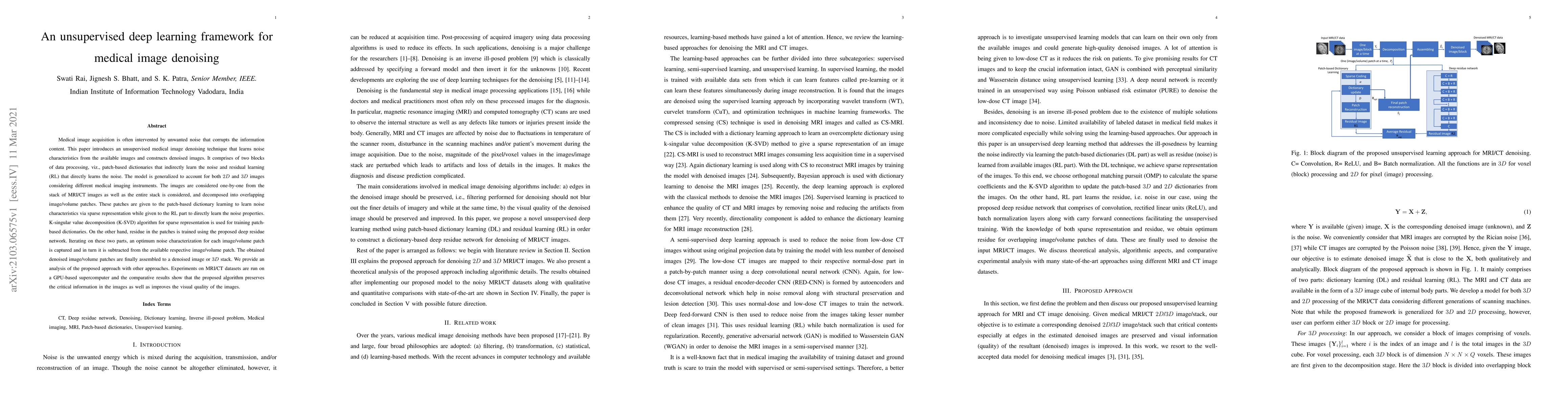 This paper presents an unsupervised deep learning framework for denoising medical images, utilizing patch-based dictionary learning and residual learning to characterize and remove noise. Experiments on MRI/CT datasets demonstrate superior preservation of critical information and improved visual quality compared to other methods.