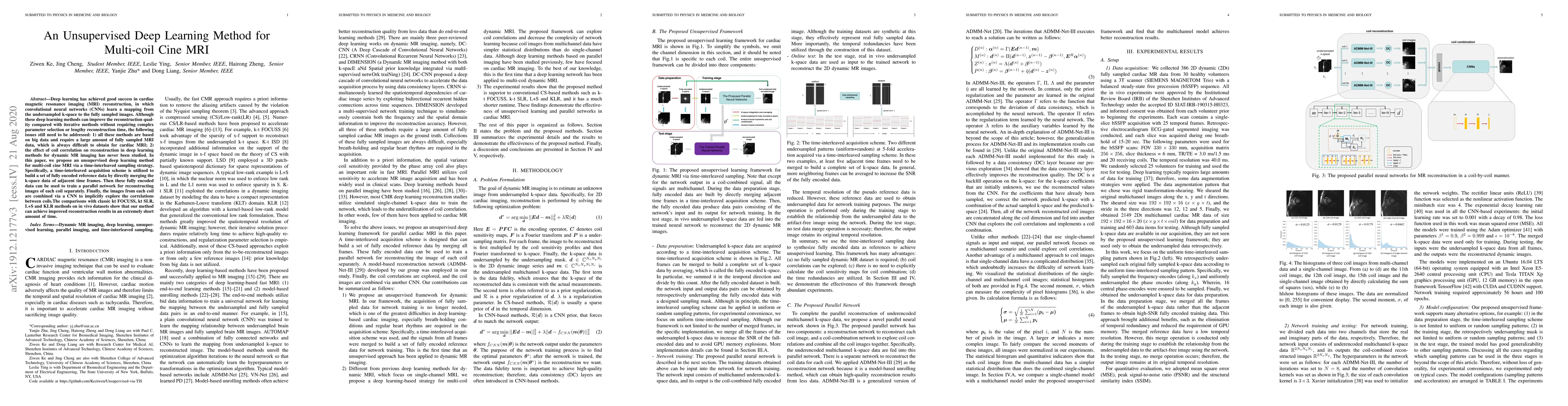 This paper proposes an unsupervised deep learning method for multi-coil cine MRI reconstruction using a time-interleaved sampling strategy. The method trains a parallel network for each coil and combines them via a CNN to explore coil correlations, achieving improved reconstruction results quickly compared to traditional methods.