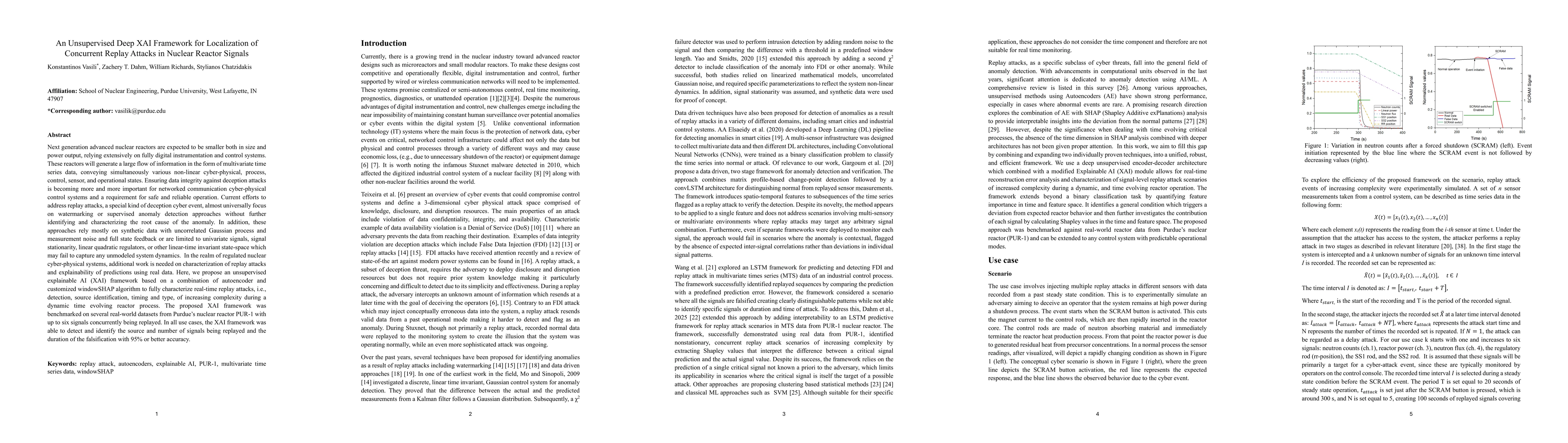 Next generation advanced nuclear reactors are expected to be smaller both in size and power output, relying extensively on fully digital instrumentation and control systems. These reactors will generate a large flow of information in the form of multivariate time series data, conveying simultaneously various non linear cyber physical, process, control, sensor, and operational states. Ensuring data integrity against deception attacks is becoming increasingly important for networked communication and a requirement for safe and reliable operation. Current efforts to address replay attacks, almost universally focus on watermarking or supervised anomaly detection approaches without further identifying and characterizing the root cause of the anomaly. In addition, these approaches rely mostly on synthetic data with uncorrelated Gaussian process and measurement noise and full state feedback or are limited to univariate signals, signal stationarity, linear quadratic regulators, or other linear-time invariant state-space which may fail to capture any unmodeled system dynamics. In the realm of regulated nuclear cyber-physical systems, additional work is needed on characterization of replay attacks and explainability of predictions using real data. Here, we propose an unsupervised explainable AI framework based on a combination of autoencoder and customized windowSHAP algorithm to fully characterize real-time replay attacks, i.e., detection, source identification, timing and type, of increasing complexity during a dynamic time evolving reactor process. The proposed XAI framework was benchmarked on several real world datasets from Purdue's nuclear reactor PUR-1 with up to six signals concurrently being replayed. In all cases, the XAI framework was able to detect and identify the source and number of signals being replayed and the duration of the falsification with 95 percent or better accuracy.
