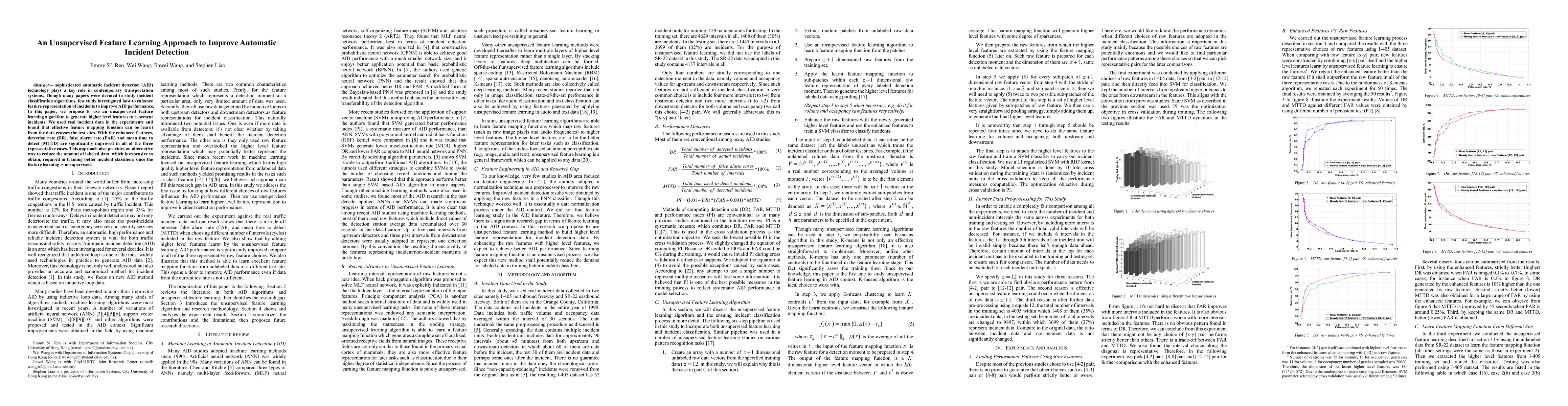 This paper proposes an unsupervised feature learning approach to enhance automatic incident detection (AID) by generating higher-level features from real incident data. The method significantly improves detection rate, false alarm rate, and mean time to detect, while reducing the need for expensive labeled data.