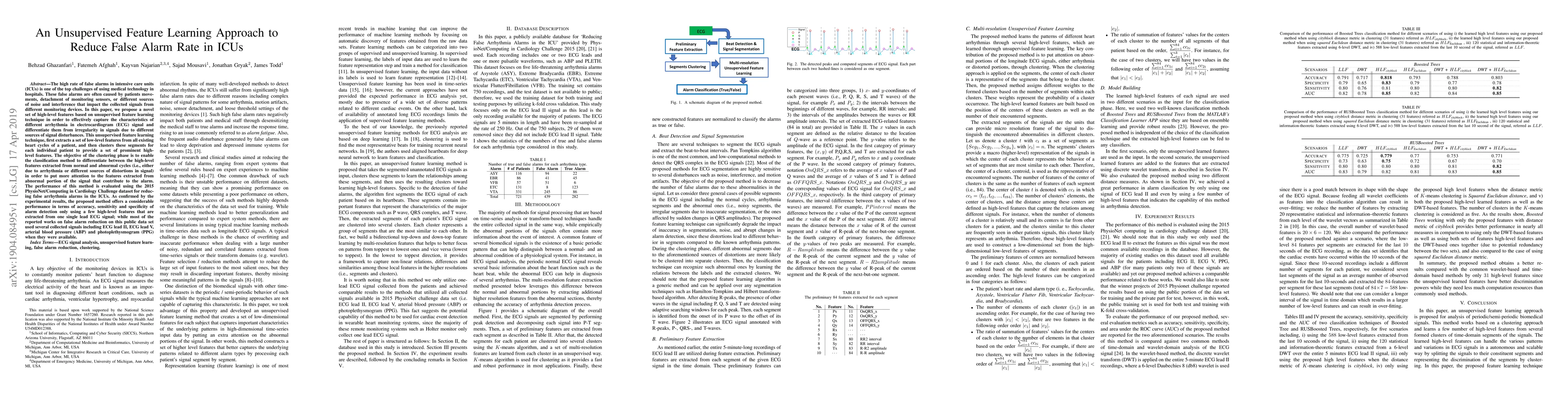 This paper proposes an unsupervised feature learning approach to reduce false alarm rates in ICUs by extracting high-level features from ECG signals to distinguish arrhythmia from signal disturbances. The method clusters low-level features to identify prominent high-level features, improving the accuracy, sensitivity, and specificity of alarm detection.