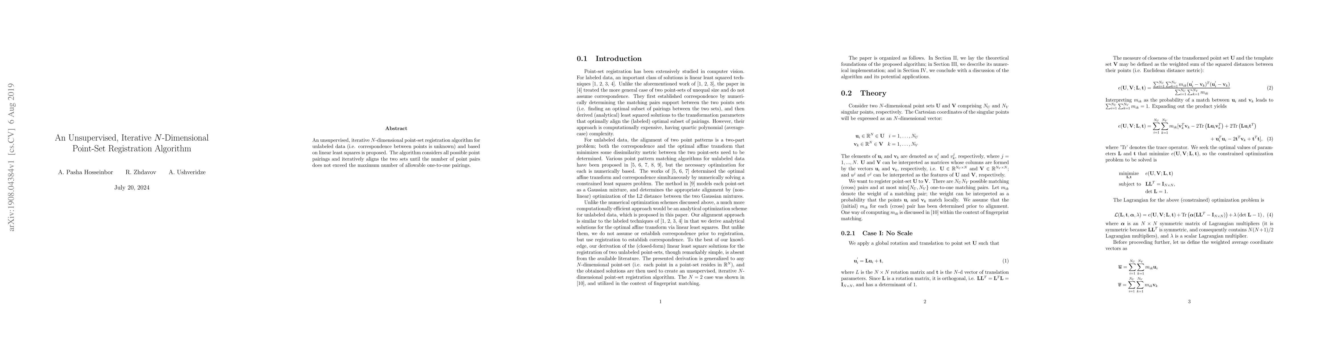 This paper introduces an unsupervised, iterative algorithm for registering N-dimensional point clouds without initial correspondences. It uses linear least squares to iteratively align point sets by considering all possible pairings until a maximum one-to-one correspondence is achieved.