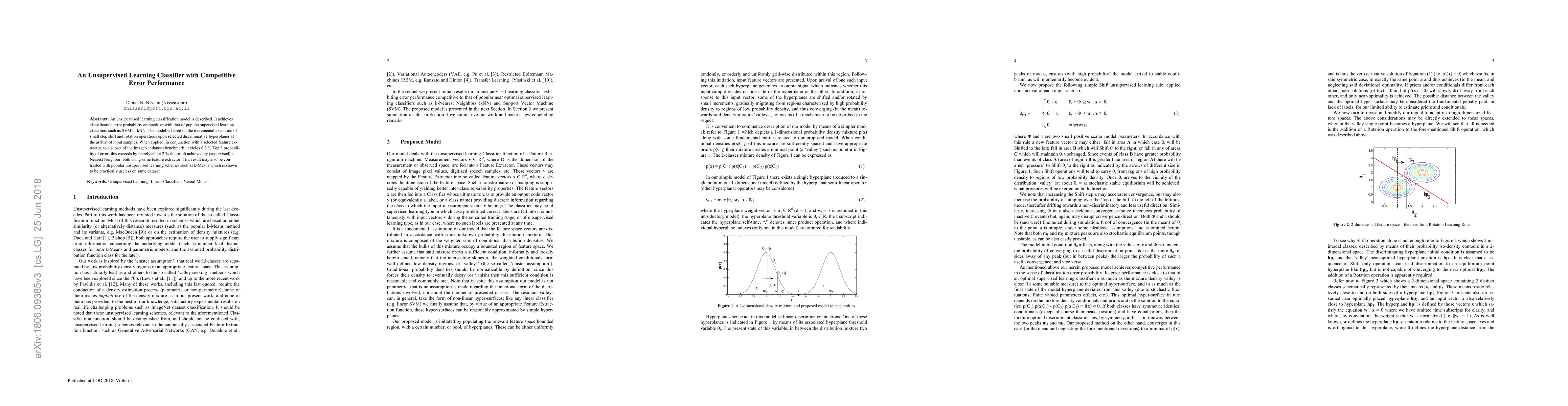 An unsupervised learning classification model is described. It achieves classification error probability competitive with that of popular supervised learning classifiers such as SVM or kNN. The model is based on the incremental execution of small step shift and rotation operations upon selected discriminative hyperplanes at the arrival of input samples. When applied, in conjunction with a selected feature extractor, to a subset of the ImageNet dataset benchmark, it yields 6.2 % Top 3 probability of error; this exceeds by merely about 2 % the result achieved by (supervised) k-Nearest Neighbor, both using same feature extractor. This result may also be contrasted with popular unsupervised learning schemes such as k-Means which is shown to be practically useless on same dataset.