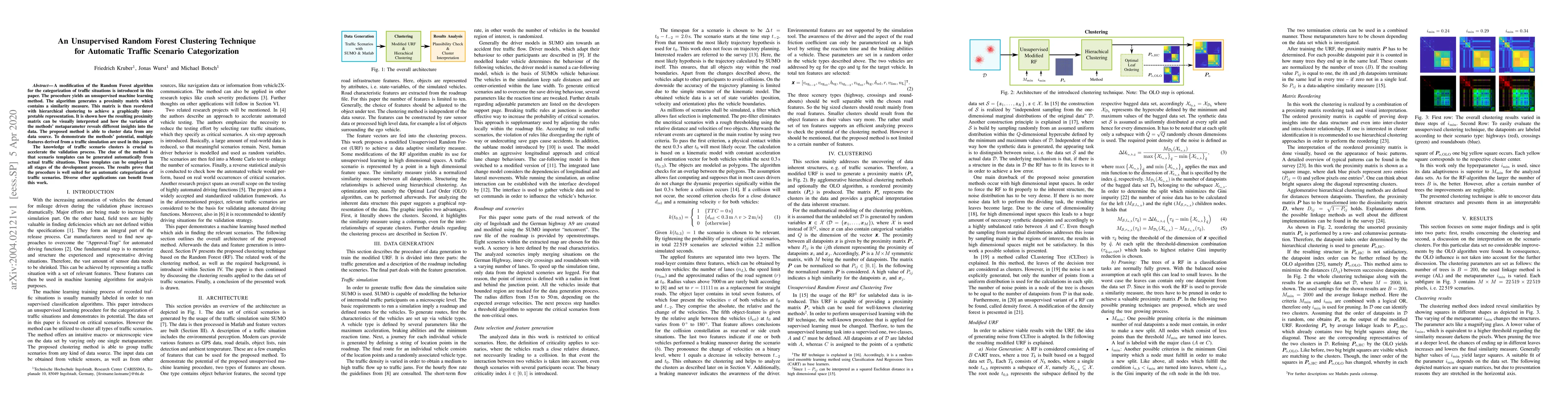A modification of the Random Forest algorithm for the categorization of traffic situations is introduced in this paper. The procedure yields an unsupervised machine learning method. The algorithm generates a proximity matrix which contains a similarity measure. This matrix is then reordered with hierarchical clustering to achieve a graphically interpretable representation. It is shown how the resulting proximity matrix can be visually interpreted and how the variation of the methods' metaparameter reveals different insights into the data. The proposed method is able to cluster data from any data source. To demonstrate the methods' potential, multiple features derived from a traffic simulation are used in this paper. The knowledge of traffic scenario clusters is crucial to accelerate the validation process. The clue of the method is that scenario templates can be generated automatically from actual traffic situations. These templates can be employed in all stages of the development process. The results prove that the procedure is well suited for an automatic categorization of traffic scenarios. Diverse other applications can benefit from this work.