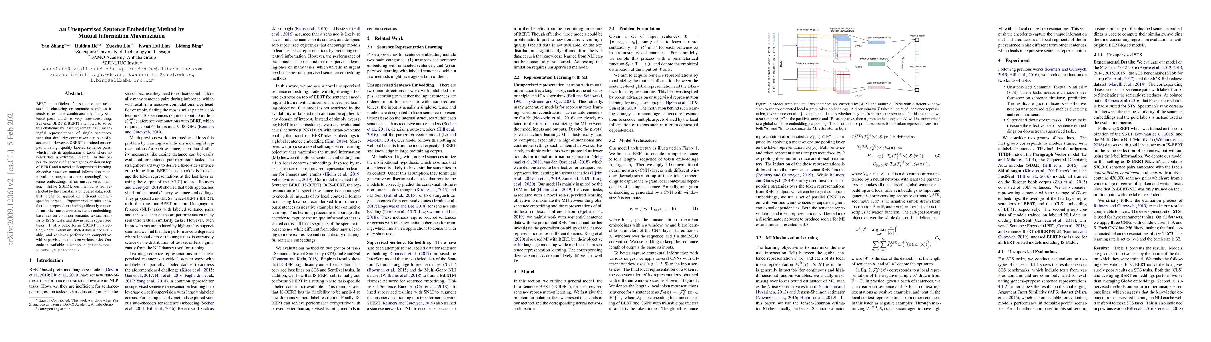 This paper introduces a lightweight, unsupervised method for generating meaningful sentence embeddings based on mutual information maximization, overcoming the limitations of BERT and SBERT in tasks requiring unlabeled data. The proposed method outperforms other unsupervised baselines and matches the performance of supervised methods in scenarios with limited labeled data.