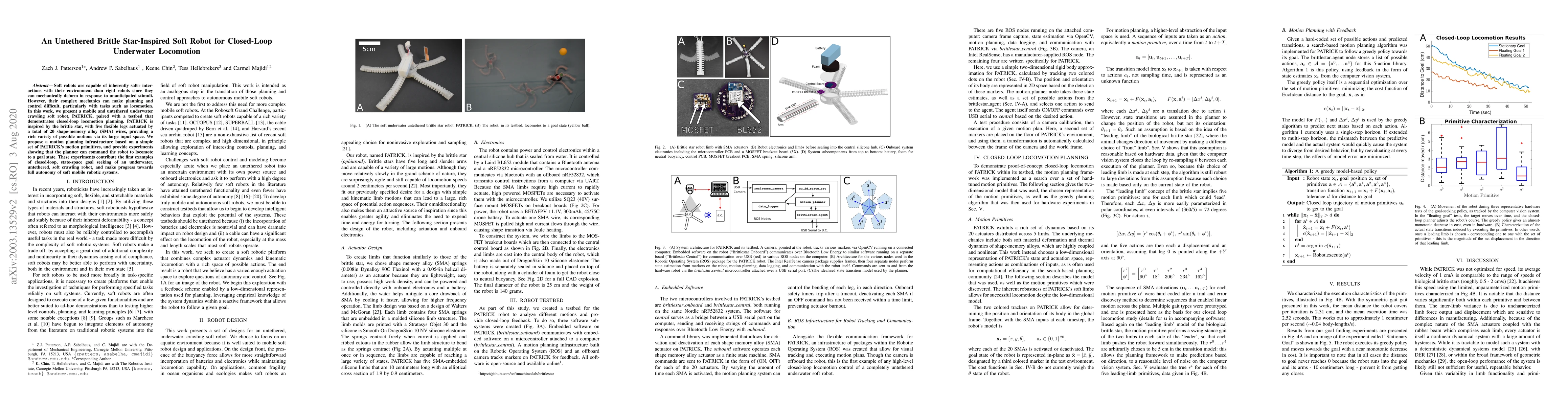 This paper introduces PATRICK, an untethered, soft robot inspired by brittle stars, featuring five flexible legs driven by shape-memory alloy wires for diverse underwater locomotion. The study proposes a closed-loop motion planning infrastructure based on motion primitives, demonstrating the robot's ability to autonomously navigate to a goal state.