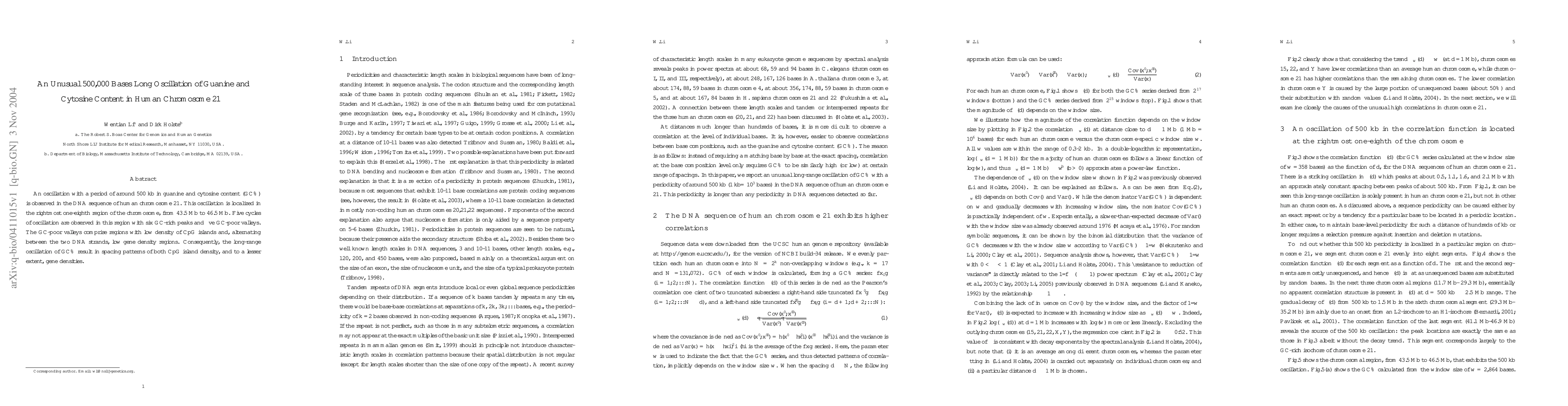 An oscillation with a period of around 500 kb in guanine and cytosine content (GC%) is observed in the DNA sequence of human chromosome 21. This oscillation is localized in the rightmost one-eighth region of the chromosome, from 43.5 Mb to 46.5 Mb. Five cycles of oscillation are observed in this region with six GC-rich peaks and five GC-poor valleys. The GC-poor valleys comprise regions with low density of CpG islands and, alternating between the two DNA strands, low gene density regions. Consequently, the long-range oscillation of GC% result in spacing patterns of both CpG island density, and to a lesser extent, gene densities.