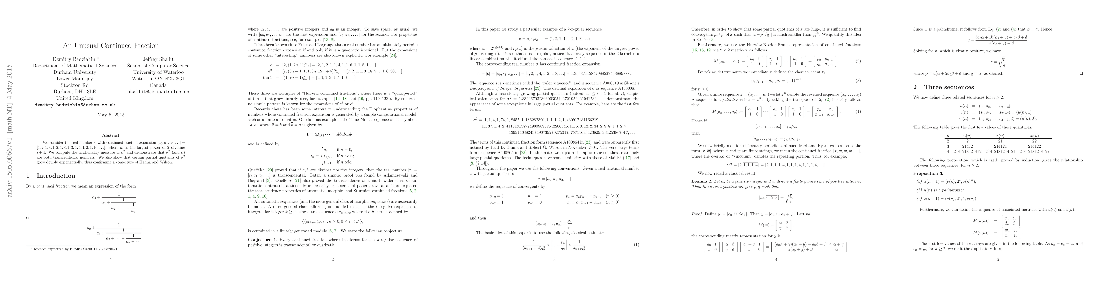 We consider the real number $\sigma$ with continued fraction expansion $[a_0, a_1, a_2,\ldots] = [1,2,1,4,1,2,1,8,1,2,1,4,1,2,1,16,\ldots]$, where $a_i$ is the largest power of $2$ dividing $i+1$. We compute the irrationality measure of $\sigma^2$ and demonstrate that $\sigma^2$ (and $\sigma$) are both transcendental numbers. We also show that certain partial quotients of $\sigma^2$ grow doubly exponentially, thus confirming a conjecture of Hanna and Wilson.