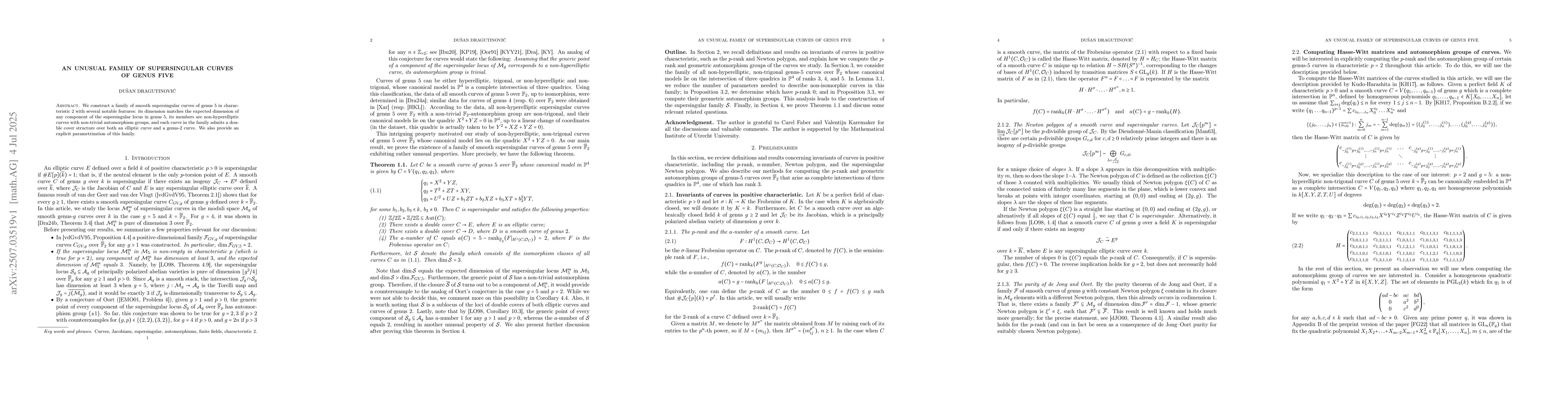 This research constructs a unique family of smooth supersingular curves of genus 5 in characteristic 2. The family has notable features including matching expected dimension, non-hyperelliptic curves with non-trivial automorphism groups, and each curve's ability to form double cover structures over both elliptic and genus-2 curves. An explicit parametrization of this family is also provided.