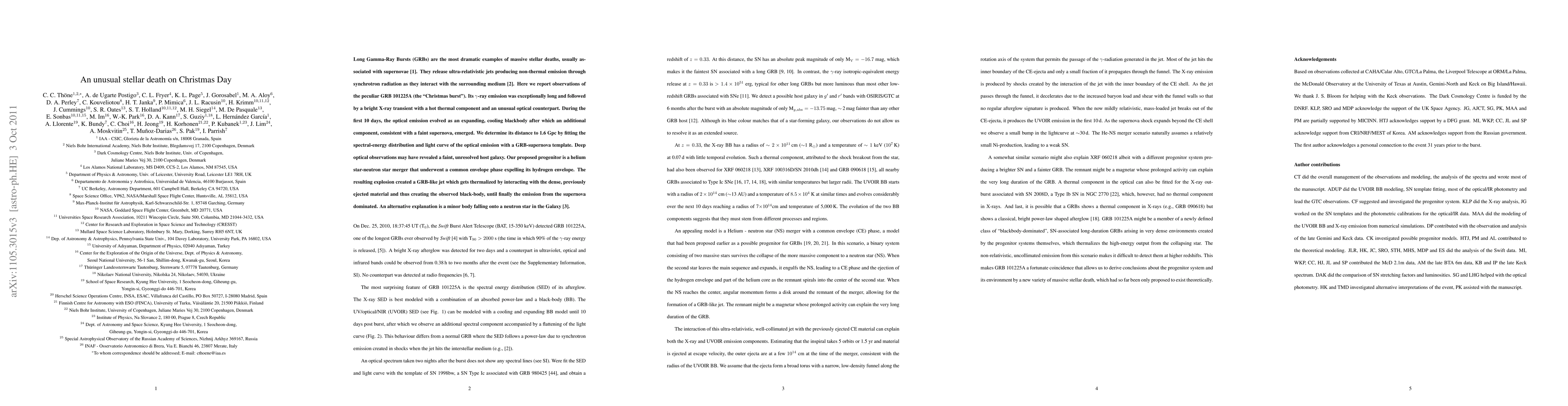 GRB 101225A, dubbed the 'Christmas burst', was an unusually long gamma-ray event linked to a bright X-ray transient and optical counterpart. The researchers determined its distance to 1.6 billion light-years, suggesting a helium star-neutron star merger as the progenitor. The explosion created a GRB-like jet thermalized by previously ejected material, producing observed blackbody radiation before a supernova component dominated. An alternative theory involves a minor body falling onto a neutron star.