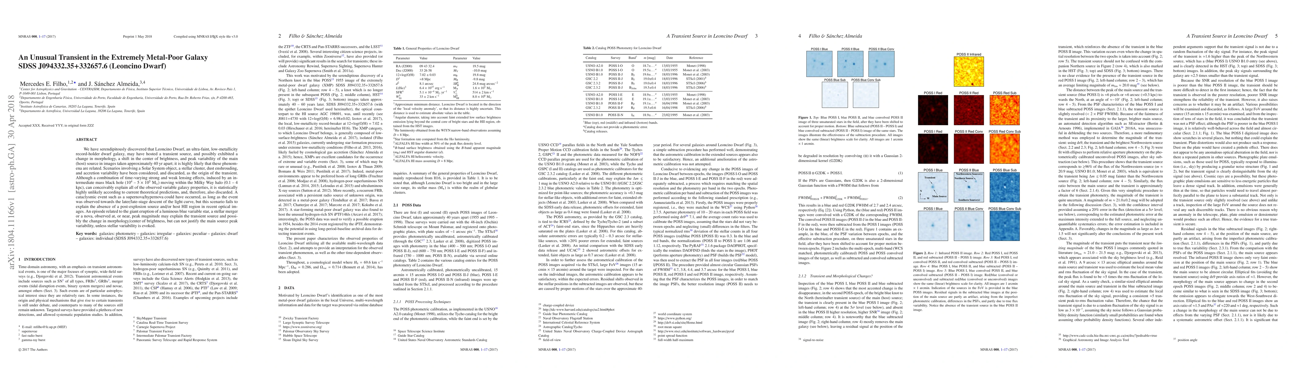 We have serendipitously discovered that Leoncino Dwarf, an ultra-faint, low-metallicity record-holder dwarf galaxy, may have hosted a transient source, and possibly exhibited a change in morphology, a shift in the center of brightness, and peak variability of the main (host) source in images taken approximately 40 yr apart; it is highly likely that these phenomena are related. Scenarios involving a Solar System object, a stellar cluster, dust enshrouding, and accretion variability have been considered, and discarded, as the origin of the transient. Although a combination of time-varying strong and weak lensing effects, induced by an intermediate mass black hole (10$^4$ - 5 $\times$ 10$^{5}$ M$_{\odot}$) moving within the Milky Way halo (0.1 -- 4 kpc), can conceivably explain all of the observed variable galaxy properties, it is statistically highly unlikely according to current theoretical predictions, and, therefore, also discarded. A cataclysmic event such as a supernova/hypernova could have occurred, as long as the event was observed towards the later/late-stage descent of the light curve, but this scenario fails to explain the absence of a post-explosion source and/or host HII region in recent optical images. An episode related to the giant eruption of a luminous blue variable star, a stellar merger or a nova, observed at, or near, peak magnitude may explain the transient source and possibly the change in morphology/center of brightness, but can not justify the main source peak variability, unless stellar variability is evoked.