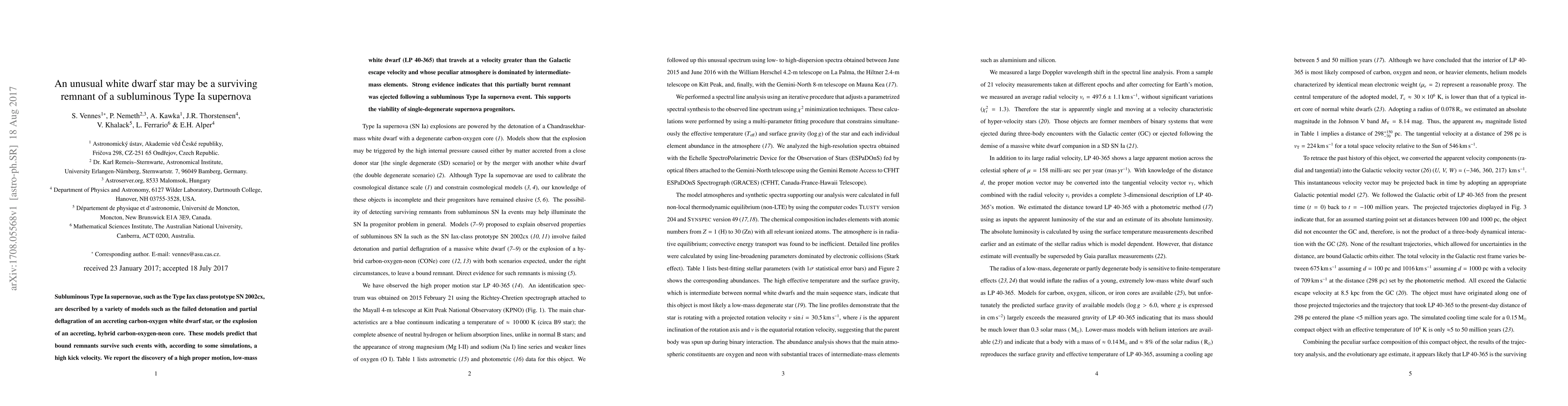 This paper reports the discovery of a high-velocity, low-mass white dwarf star (LP 40-365) that likely survived a subluminous Type Ia supernova, providing support for single-degenerate progenitor models of such supernovae. The star's peculiar atmosphere suggests it was ejected with a high kick velocity following a Type Iax supernova event.