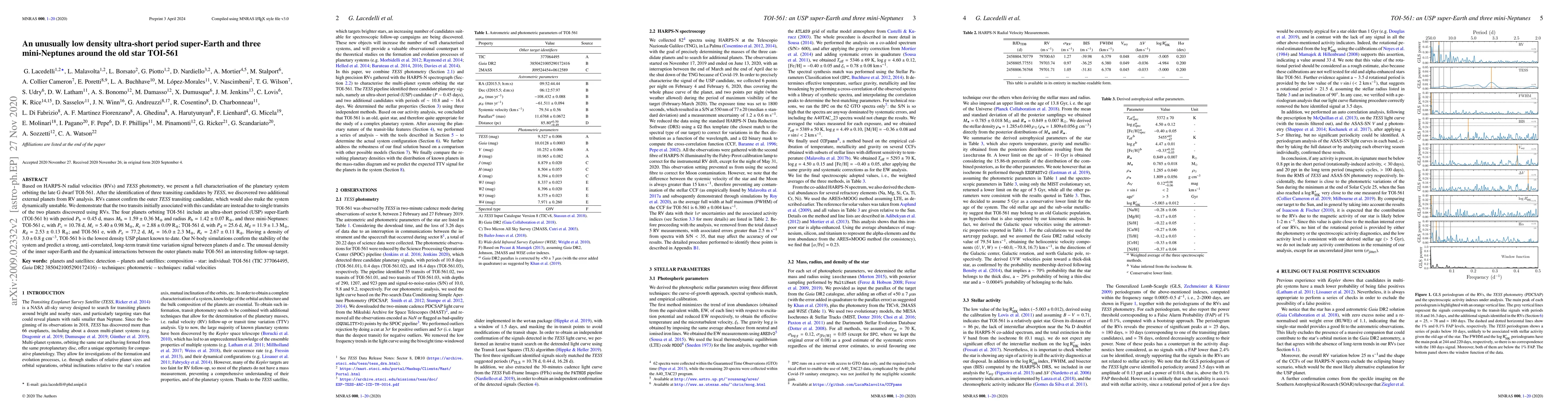 Based on HARPS-N radial velocities (RVs) and TESS photometry, we present a full characterisation of the planetary system orbiting the late G dwarf TOI-561. After the identification of three transiting candidates by TESS, we discovered two additional external planets from RV analysis. RVs cannot confirm the outer TESS transiting candidate, which would also make the system dynamically unstable. We demonstrate that the two transits initially associated with this candidate are instead due to single transits of the two planets discovered using RVs. The four planets orbiting TOI-561 include an ultra-short period (USP) super-Earth (TOI-561 b) with period $P_{\rm b} = 0.45$ d, mass $M_{\rm b} =1.59 \pm 0.36$ M$_\oplus$ and radius $R_{\rm b}=1.42 \pm 0.07$ R$_\oplus$, and three mini-Neptunes: TOI-561 c, with $P_{\rm c} = 10.78$ d, $M_{\rm c} = 5.40 \pm 0.98$ M$_\oplus$, $R_{\rm c}= 2.88 \pm 0.09$ R$_\oplus$; TOI-561 d, with $P_{\rm d} = 25.6$ d, $M_{\rm d} = 11.9 \pm 1.3$ M$_\oplus$, $R_{\rm d} = 2.53 \pm 0.13$ R$_\oplus$; and TOI-561 e, with $P_{\rm e} = 77.2$ d, $M_{\rm e} = 16.0 \pm 2.3$ M$_\oplus$, $R_{\rm e} = 2.67 \pm 0.11$ R$_\oplus$. Having a density of $3.0 \pm 0.8$ g cm$^{-3}$, TOI-561 b is the lowest density USP planet known to date. Our N-body simulations confirm the stability of the system and predict a strong, anti-correlated, long-term transit time variation signal between planets d and e. The unusual density of the inner super-Earth and the dynamical interactions between the outer planets make TOI-561 an interesting follow-up target.