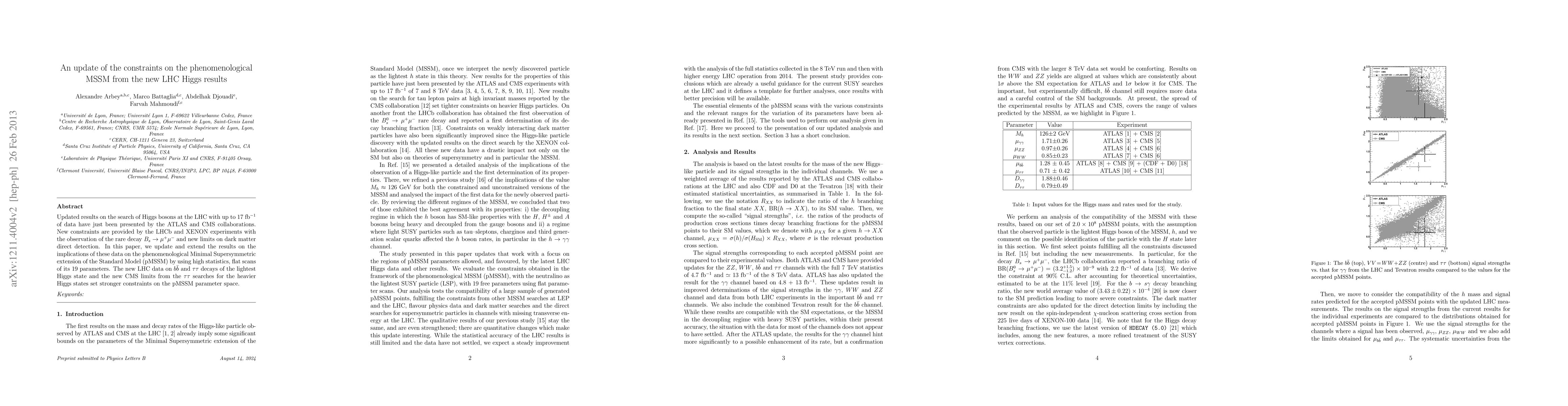 Updated results on the search of Higgs bosons at the LHC with up to 17/fb of data have just been presented by the ATLAS and CMS collaborations. New constraints are provided by the LHCb and XENON experiments with the observation of the rare decay B_s -> mu+mu- and new limits on dark matter direct detection. In this paper, we update and extend the results on the implications of these data on the phenomenological Minimal Supersymmetric extension of the Standard Model (pMSSM) by using high statistics, flat scans of its 19 parameters. The new LHC data on bb and tau tau decays of the lightest Higgs state and the new CMS limits from the tau tau searches for the heavier Higgs states set stronger constraints on the pMSSM parameter space.