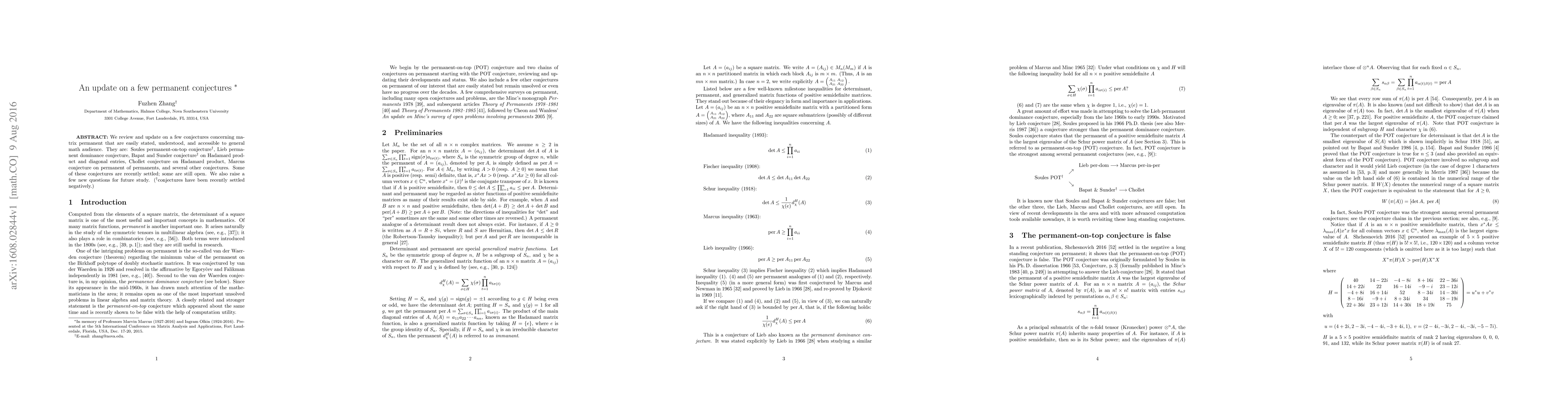 We review and update on a few conjectures concerning matrix permanent that are easily stated, understood, and accessible to general math audience. They are: Soules permanent-on-top conjecture${}^\dagger$, Lieb permanent dominance conjecture, Bapat and Sunder conjecture${}^\dagger$ on Hadamard product and diagonal entries, Chollet conjecture on Hadamard product, Marcus conjecture on permanent of permanents, and several other conjectures. Some of these conjectures are recently settled; some are still open. We also raise a few new questions for future study. (${}^\dagger$conjectures have been recently settled negatively.)