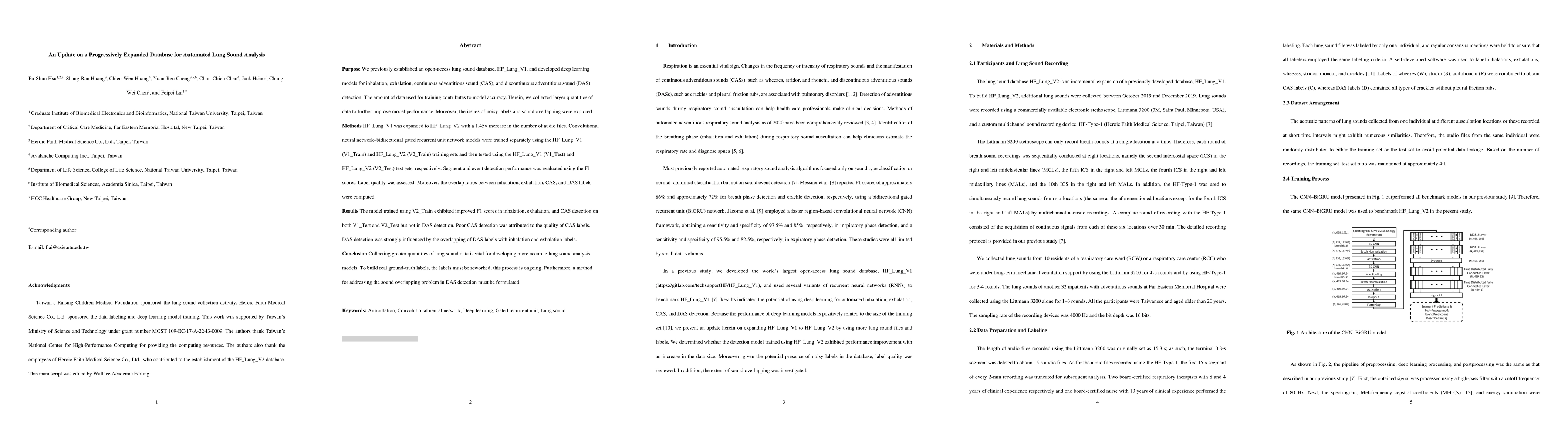 Purpose: We previously established an open-access lung sound database, HF_Lung_V1, and developed deep learning models for inhalation, exhalation, continuous adventitious sound (CAS), and discontinuous adventitious sound (DAS) detection. The amount of data used for training contributes to model accuracy. Herein, we collected larger quantities of data to further improve model performance. Moreover, the issues of noisy labels and sound overlapping were explored. Methods: HF_Lung_V1 was expanded to HF_Lung_V2 with a 1.45x increase in the number of audio files. Convolutional neural network-bidirectional gated recurrent unit network models were trained separately using the HF_Lung_V1 (V1_Train) and HF_Lung_V2 (V2_Train) training sets and then tested using the HF_Lung_V1 (V1_Test) and HF_Lung_V2 (V2_Test) test sets, respectively. Segment and event detection performance was evaluated using the F1 scores. Label quality was assessed. Moreover, the overlap ratios between inhalation, exhalation, CAS, and DAS labels were computed. Results: The model trained using V2_Train exhibited improved F1 scores in inhalation, exhalation, and CAS detection on both V1_Test and V2_Test but not in DAS detection. Poor CAS detection was attributed to the quality of CAS labels. DAS detection was strongly influenced by the overlapping of DAS labels with inhalation and exhalation labels. Conclusion: Collecting greater quantities of lung sound data is vital for developing more accurate lung sound analysis models. To build real ground-truth labels, the labels must be reworked; this process is ongoing. Furthermore, a method for addressing the sound overlapping problem in DAS detection must be formulated.