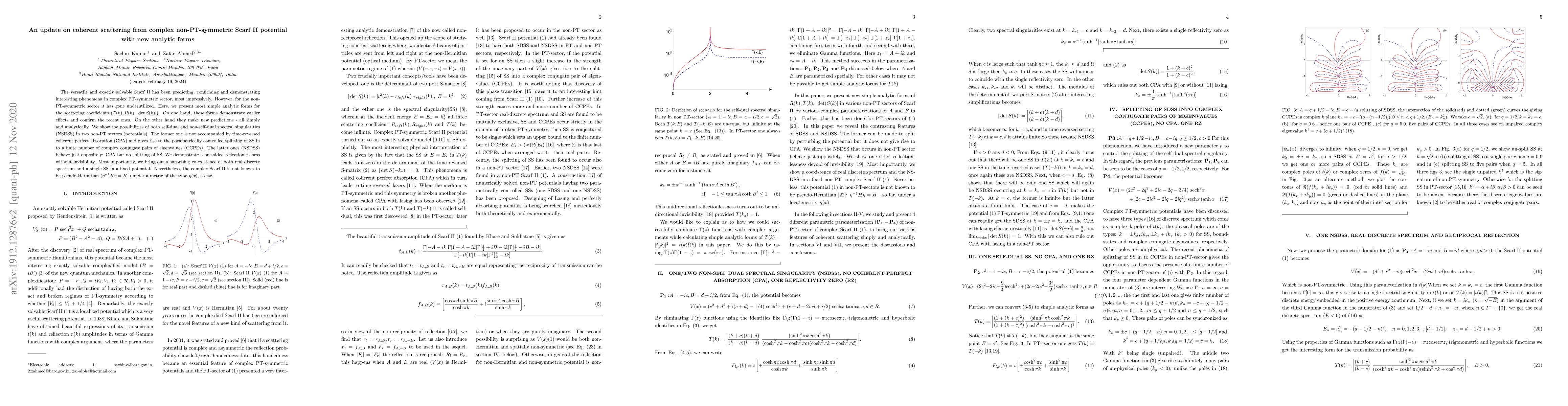 The versatile and exactly solvable Scarf II has been predicting, confirming and demonstrating interesting phenomena in complex PT-symmetric sector, most impressively. However, for the non-PT-symmetric sector it has gone underutilized. Here, we present most simple analytic forms for the scattering coefficients $(T(k),R(k),|\det S(k)|)$. On one hand, these forms demonstrate earlier effects and confirm the recent ones. On the other hand they make new predictions - all simply and analytically. We show the possibilities of both self-dual and non-self-dual spectral singularities (NSDSS) in two non-PT sectors (potentials). The former one is not accompanied by time-reversed coherent perfect absorption (CPA) and gives rise to the parametrically controlled splitting of SS in to a finite number of complex conjugate pairs of eigenvalues (CCPEs). The latter ones (NSDSS) behave just oppositely: CPA but no splitting of SS. We demonstrate a one-sided reflectionlessness without invisibility. Most importantly, we bring out a surprising co-existence of both real discrete spectrum and a single SS in a fixed potential. Nevertheless, the complex Scarf II is not known to be pseudo-Hermitian ($\eta^{-1} H\eta=H^\dagger$) under a metric of the type $\eta(x)$, so far.