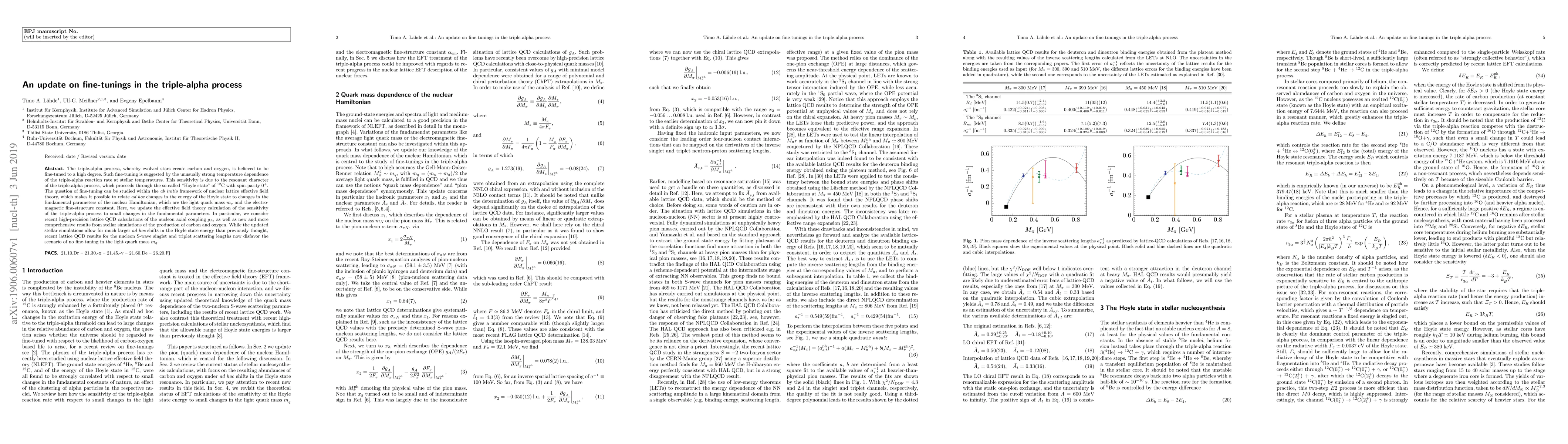 The triple-alpha process, whereby evolved stars create carbon and oxygen, is believed to be fine-tuned to a high degree. Such fine-tuning is suggested by the unusually strong temperature dependence of the triple-alpha reaction rate at stellar temperatures. This sensitivity is due to the resonant character of the triple-alpha process, which proceeds through the so-called "Hoyle state" of $^{12}$C with spin-parity $0^+$. The question of fine-tuning can be studied within the {\it ab initio} framework of nuclear lattice effective field theory, which makes it possible to relate {\it ad hoc} changes in the energy of the Hoyle state to changes in the fundamental parameters of the nuclear Hamiltonian, which are the light quark mass $m_q$ and the electromagnetic fine-structure constant. Here, we update the effective field theory calculation of the sensitivity of the triple-alpha process to small changes in the fundamental parameters. In particular, we consider recent high-precision lattice QCD calculations of the nucleon axial coupling $g_A$, as well as new and more comprehensive results from stellar simulations of the production of carbon and oxygen. While the updated stellar simulations allow for much larger {\it ad hoc} shifts in the Hoyle state energy than previously thought, recent lattice QCD results for the nucleon S-wave singlet and triplet scattering lengths now disfavor the scenario of no fine-tuning in the light quark mass $m_q$.