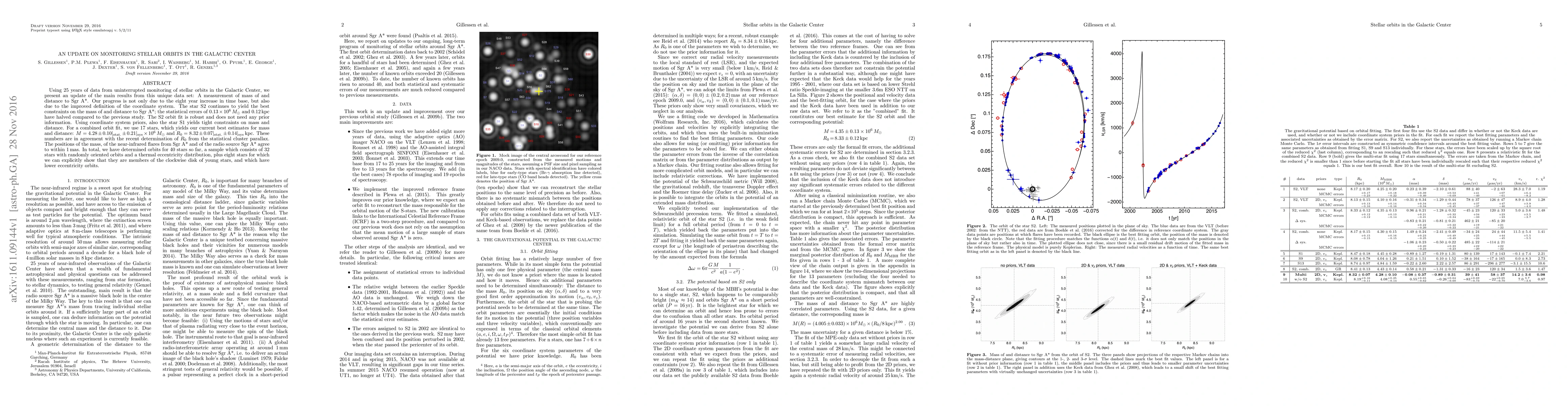 This paper updates the mass and distance measurements of SgrA* using 25 years of stellar orbit data in the Galactic Center, achieving improved constraints with the star S2. The best estimates for SgrA*'s mass and distance are M = 4.28 ± 0.10|stat. +/. 0.21|sys. x 10^6 M_sun and R_0 = 8.32 ± 0.07|stat. +/- 0.14|sys. kpc, respectively.