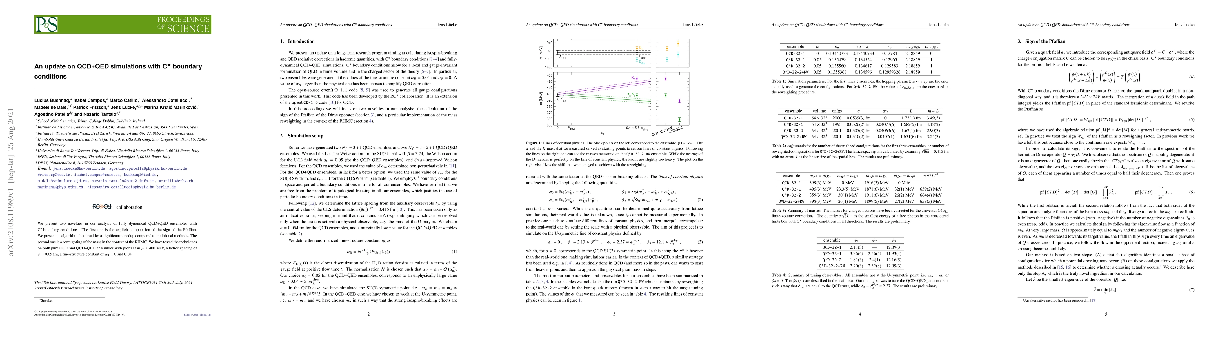 We present two novelties in our analysis of fully dynamical QCD+QED ensembles with C* boundary conditions. The first one is the explicit computation of the sign of the Pfaffian. We present an algorithm that provides a significant speedup compared to traditional methods. The second one is a reweighting of the mass in the context of the RHMC. We have tested the techniques on both pure QCD and QCD+QED ensembles with pions at $m_{\pi^\pm}\approx400$ MeV, a lattice spacing of $a\approx0.05$ fm, a fine-structure constant of $\alpha_{\mathrm{R}}=0$ and $0.04$.