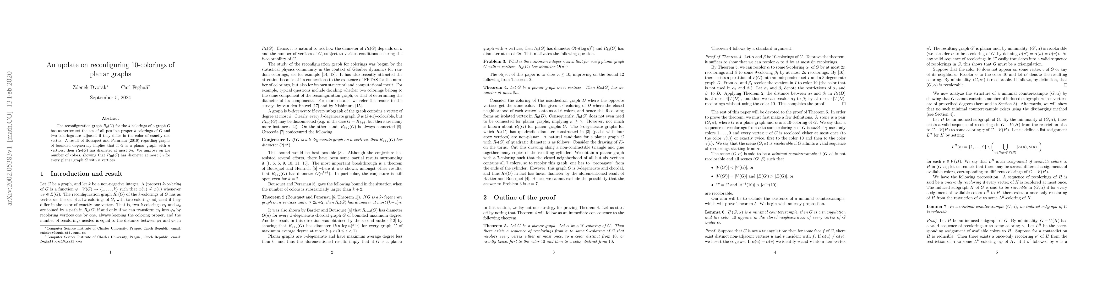 This paper improves the diameter of the reconfiguration graph for $10$-colorings of planar graphs, showing that $R_{10}(G)$ has a diameter of at most $8n$ for any planar graph $G$ with $n$ vertices, surpassing the previous result for $12$-colorings.