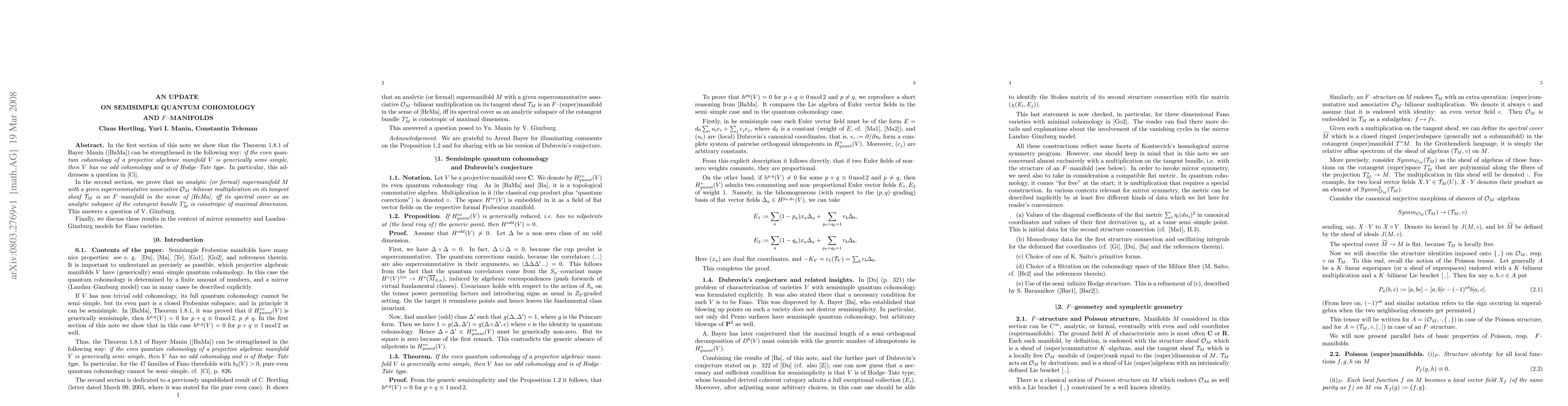 In the first section of this note we show that the Theorem 1.8.1 of Bayer--Manin ([BaMa]) can be strengthened in the following way: {\it if the even quantum cohomology of a projective algebraic manifold $V$ is generically semi--simple, then $V$ has no odd cohomology and is of Hodge--Tate type.} In particular, this addressess a question in [Ci]. In the second section, we prove that {\it an analytic (or formal) supermanifold $M$ with a given supercommutative associative $\Cal{O}_M$--bilinear multiplication on its tangent sheaf $\Cal{T}_M$ is an $F$--manifold in the sense of [HeMa], iff its spectral cover as an analytic subspace of the cotangent bundle $T^*_M$ is coisotropic of maximal dimension.} This answers a question of V. Ginzburg. Finally, we discuss these results in the context of mirror symmetry and Landau--Ginzburg models for Fano varieties.
