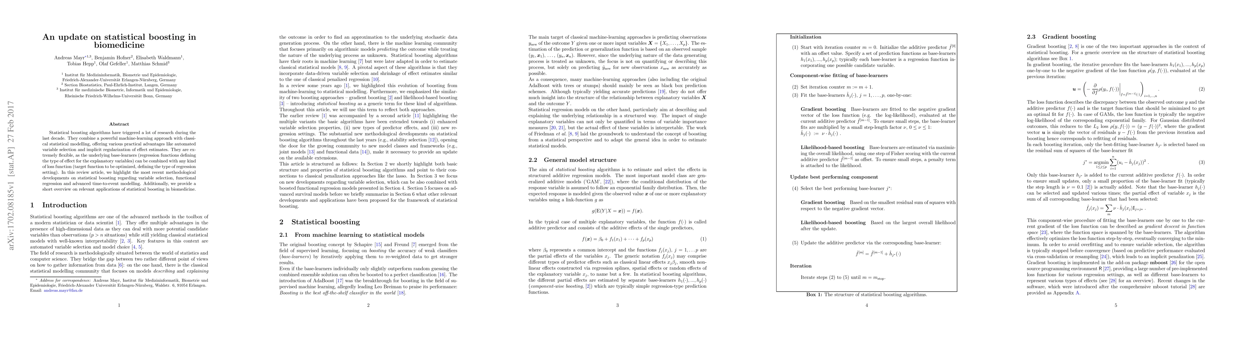 This review article highlights recent developments in statistical boosting methods for biomedicine, including variable selection, functional regression, and advanced time-to-event modeling, offering practical advantages such as automated variable selection and implicit regularization.