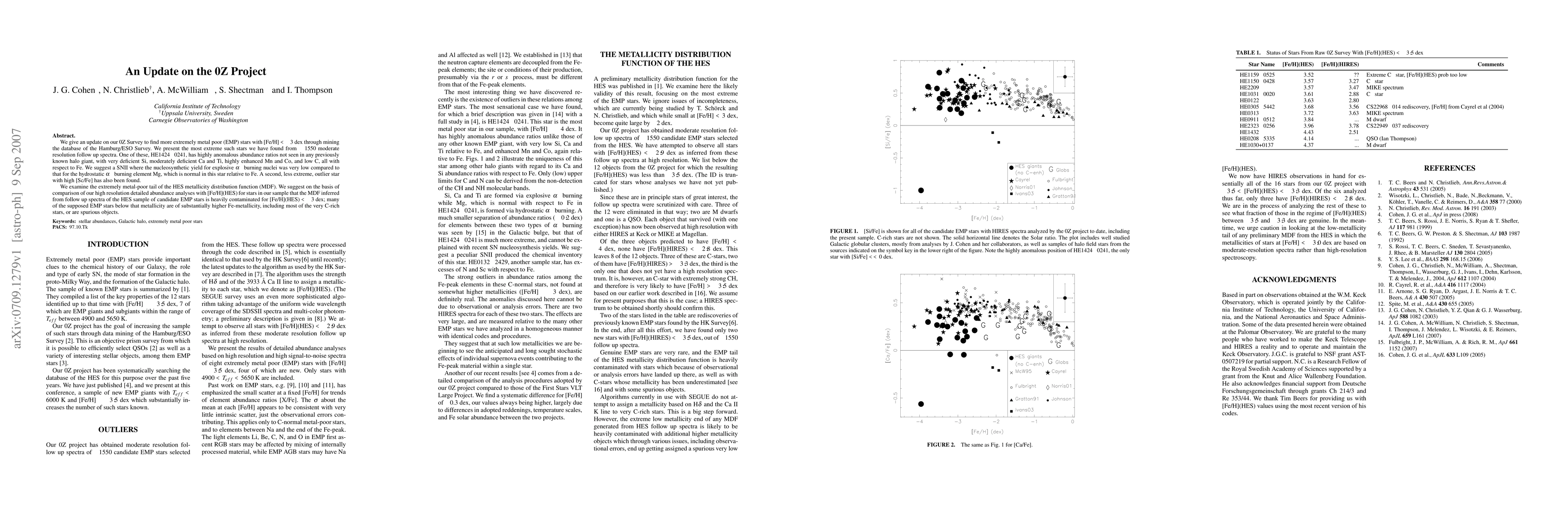 We give an update on our 0Z Survey to find more extremely metal poor (EMP) stars with [Fe/H] < -3 dex through mining the database of the Hamburg/ESO Survey. We present the most extreme such stars we have found from ~1550 moderate resolution follow up spectra. One of these, HE1424-0241, has highly anomalous abundance ratios not seen in any previously known halo giant, with very deficient Si, moderately deficient Ca and Ti, highly enhanced Mn and Co, and low C, all with respect to Fe. We suggest a SNII where the nucleosynthetic yield for explosive alpha-burning nuclei was very low compared to that for the hydrostatic alpha-burning element Mg, which is normal in this star relative to Fe. A second, less extreme, outlier star with high [Sc/Fe] has also been found. We examine the extremely metal-poor tail of the HES metallicity distribution function (MDF). We suggest on the basis of comparison of our high resolution detailed abundance analyses with [Fe/H](HES) for stars in our sample that the MDF inferred from follow up spectra of the HES sample of candidate EMP stars is heavily contaminated for [Fe/H](HES) < -3 dex; many of the supposed EMP stars below that metallicity are of substantially higher Fe-metallicity, including most of the very C-rich stars, or are spurious objects.