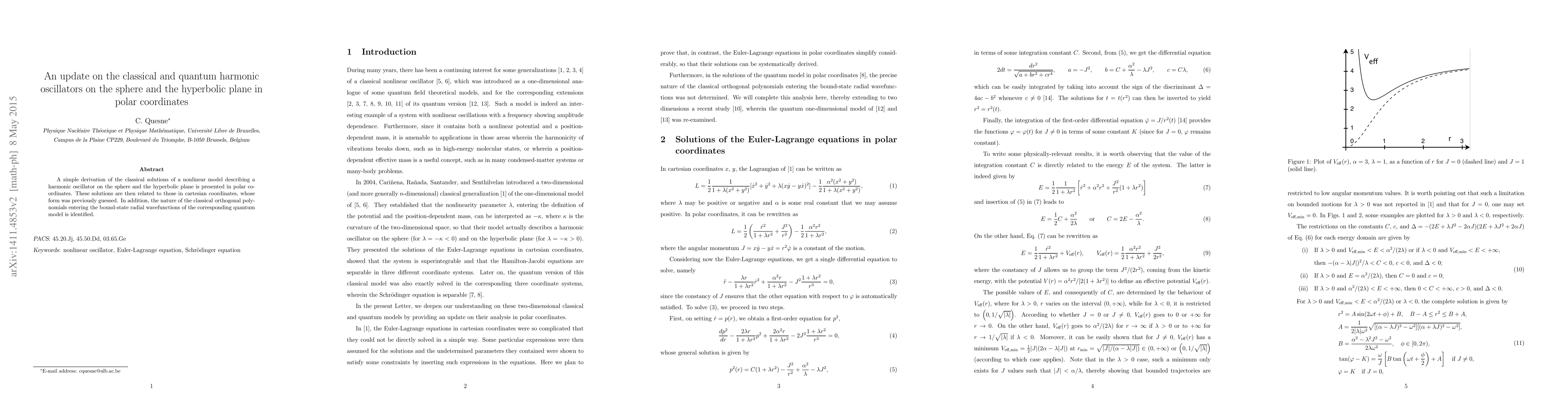 This paper derives classical solutions for a nonlinear harmonic oscillator model on the sphere and hyperbolic plane in polar coordinates, and relates them to previously guessed Cartesian forms. It also identifies the classical orthogonal polynomials relevant to the quantum model's bound-state radial wavefunctions.