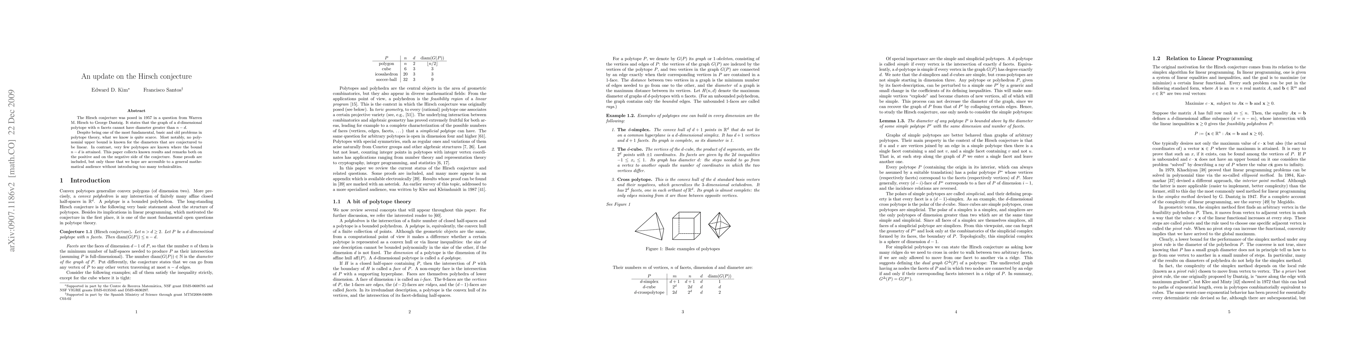 This paper reviews the Hirsch conjecture, which posits that the diameter of a d-dimensional polytope with n facets cannot exceed n - d. Despite its longstanding significance, few results support or refute this conjecture, and no polynomial upper bound is known for the diameter.
