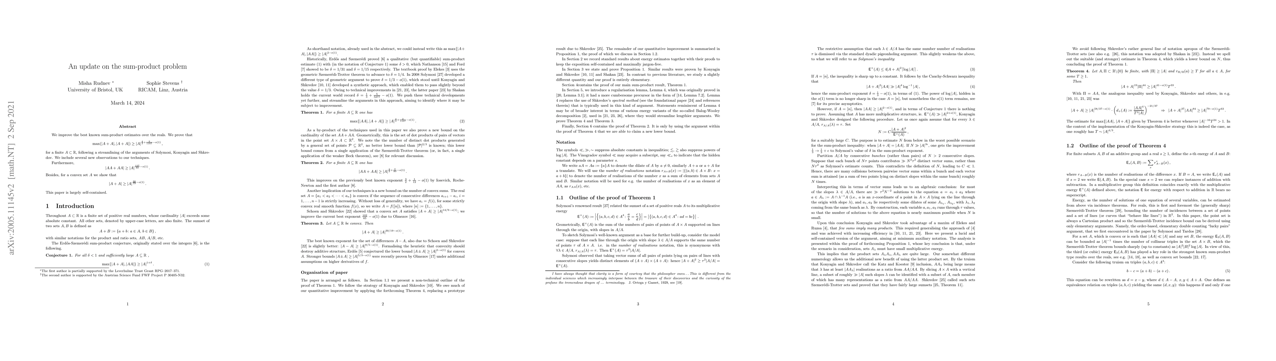 We improve the best known sum-product estimates over the reals. We prove that \[ \max(|A+A|,|AA|)\geq |A|^{\frac{4}{3} + \frac{2}{1167} - o(1)}\,, \] for a finite $A\subset \mathbb R$, following a streamlining of the arguments of Solymosi, Konyagin and Shkredov. We include several new observations to our techniques. Furthermore, \[ |AA+AA|\geq |A|^{\frac{127}{80} - o(1)}\,. \] Besides, for a convex set $A$ we show that \[ |A+A|\geq |A|^{\frac{30}{19}-o(1)}\,. \] This paper is largely self-contained.